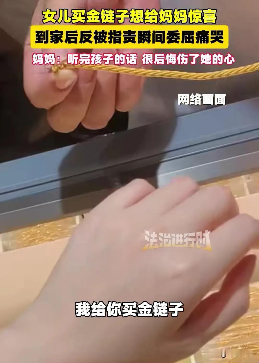 广东,小女孩骑车1小时,跑去给妈妈买了一条金项链,回来之后,第一时间送给妈妈,结果妈妈打开一看,就指责她,说小孩子懂什么,金价那么高,买来干什么,她一点都不开心,女儿委屈大哭,网友说,这个妈妈再也不会收到这么贵的礼物了。 小女孩曾经跟妈妈说:“别人的妈妈有金镯子,你没有,我要给你买金镯子,买不起金镯子,我就给你买金项链。” 她说到做到,手里一有钱,就去给妈妈买金镯子,她骑着自行车,足足骑了一个小时,才来到金店。 一进店,她就跟店员说,她要给妈妈买金镯子,可店员看到她拿来的钱,不够买金镯子,就遗憾地告诉她,她不能买金镯子。 买不了金镯子,那就买金项链,小女孩跟店员说。 小女孩带来的钱足以买一条金项链,店员一看女孩这么孝顺,直夸她有孝心,还说买金项链可以保妈妈平安,小女孩停了可高兴了。 她用心挑选了一条金项链,她知道妈妈有什么衣服,配上这条金项链,肯定是很好看的。 在小女孩看来,她的妈妈就是好看的,只要妈妈带上这条金项链,妈妈一定会很高兴,她想象着妈妈幸福的笑容,她掏钱就把金项链买了下来。 买了金项链,小女孩还买了妈妈喜欢吃的泡鸭脚,还买了一些小零食当礼物送给自己。 一路上,她骑着自行车回家,她想象着妈妈收礼物时的高兴,她一路欢快地哼着小歌。 回到家,她看到妈妈,就迫不及待地将金项链掏出来,递给妈妈,她兴奋地跟妈妈说:“我终于给你买金项链了!” 小女孩以为自己会看到母亲开心的笑容,看到母亲那幸福的样子。 可她怎么也没想到,母亲打开一看,里面果然是金项链,她很惊讶,她的第一反应并不是很开心,而是大声指责女儿:“你一个小孩子懂什么,现在金价这么高,你买这个干什么?” 小女孩一看妈妈收到金项链不开心,反而指责她,说她一个小孩子什么都不懂,买这么贵的金项链。 小女孩听了,想起自己攒了很久的钱,才够钱给妈妈买一条金项链,就是想让妈妈开心,就是想让妈妈知道,别人有的东西,妈妈也值得拥有。 可母亲却指责她,她伤心地哭了,一边哭一边跟妈妈说了自己的心里话。 小女孩可能不知道什么叫金价高,她只知道,买金项链送给妈妈,妈妈应该很开心。 可实际上妈妈指责她了,她不知道妈妈为何会这样,她只知道妈妈不开心了,她怀疑自己,是不是送项链,就是错的。 小女孩看着妈妈不开心,又拿出妈妈最爱吃的泡鸭脚,一边哭诉着自己的心里话,一边给妈妈泡鸭脚。 看着自己的女儿哭得那么伤心委屈,小女孩的妈非常后悔,她才意识到,女儿这么小,并不知道什么叫金价高,金价低,只知道钱够了,就买一条金项链给她。 她真的是太伤女儿的心了,她非常后悔。 女儿用自己的零花钱,给母亲买一条金项链,小女孩是真的很孝顺,也真的很爱妈妈,她只知道别人的妈妈有金镯子,自己的妈妈也应该有,就算她买不起金镯子,买一条金项链给妈妈也是可以的。 她只是用自己的方式爱着妈妈,她并不知道用这样的方式,换来的是妈妈的指责。 有人看到小女孩送礼物给妈妈,还要被妈妈指责,都感到不可思议,这样的妈妈,会这样拒绝女儿,或许女儿这一辈子都不会愿意再给她送礼物了。 女儿是用自己的零花钱给妈妈买礼物的,不管这份礼物是否珍贵,妈妈都应该珍惜,否则会很伤女儿的心,也不利于家风建设。 《民法典》第1043条规定:家庭应当树立优良家风,弘扬家庭美德,重视家庭文明建设。 妈妈应当维护女儿的心灵,在女儿送出礼物时,给女儿提供情绪价值,这才能有利于女儿的成长。 那么你觉得女儿以后还会给妈妈送礼物吗?