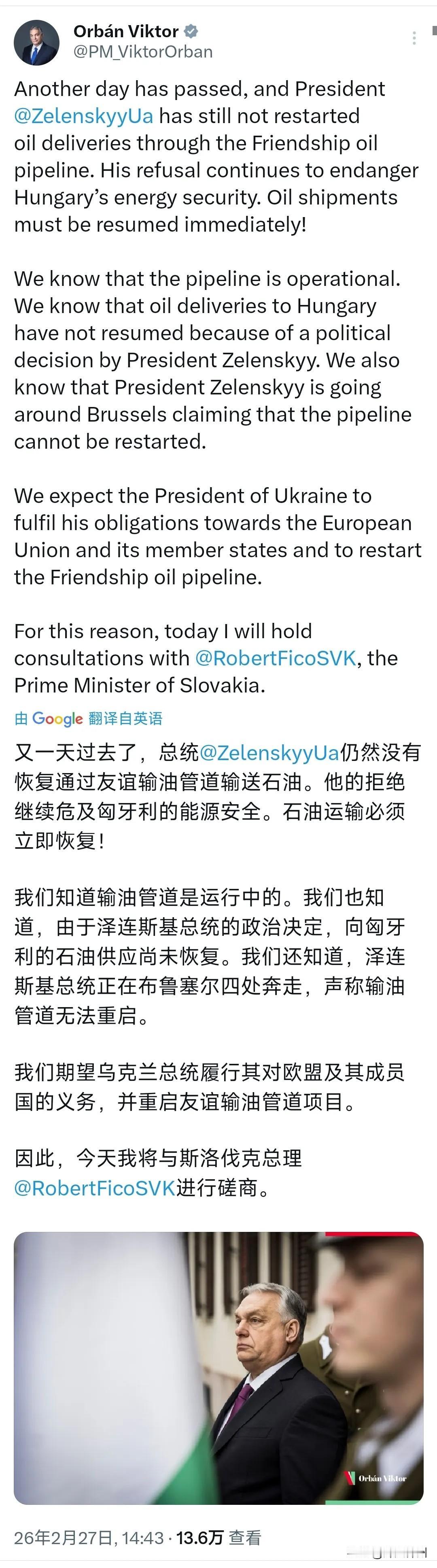 匈牙利总理欧尔班今天(北京时间2月27日)写道:“又一天过去了,泽连斯基总统仍然没有恢复通过友谊输油管道输送石油。他的拒绝继续危及匈牙利的能源安全。石油运输必须立即恢复! 我们知道输油管道是运行中的。我们也知道,由于泽连斯基总统的政治决定,向匈牙利的石油供应尚未恢复。我们还知道,泽连斯基总统正在布鲁塞尔四处奔走,声称输油管道无法重启。 我们期望乌克兰总统履行其对欧盟及其成员国的义务,并重启友谊输油管道项目。因此,今天我将与斯洛伐克总理菲佐进行磋商。” 评几句: 匈牙利总理欧尔班就友谊输油管道问题公开发表强硬表态,要求乌克兰尽快恢复石油输送。欧尔班明确表示,管道本身具备运行条件,供应中断并非技术原因,而是相关方的政治选择,这已对匈牙利的能源安全构成直接影响。 乌克兰一方面在欧盟寻求支持与援助,另一方面在能源通道问题上态度坚决,使得中东欧国家的能源供应面临压力。友谊输油管道事关地区能源稳定,长期停运势必加剧多方矛盾。 欧尔班宣布将与斯洛伐克总理菲佐举行磋商,显示出中东欧国家在维护自身能源利益上加强协调。这一事件也折射出欧盟内部的现实分歧:一边是持续对乌支持,一边是成员国对能源与民生安全的优先考量。