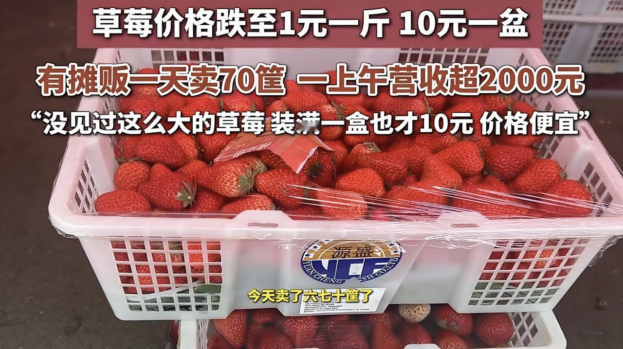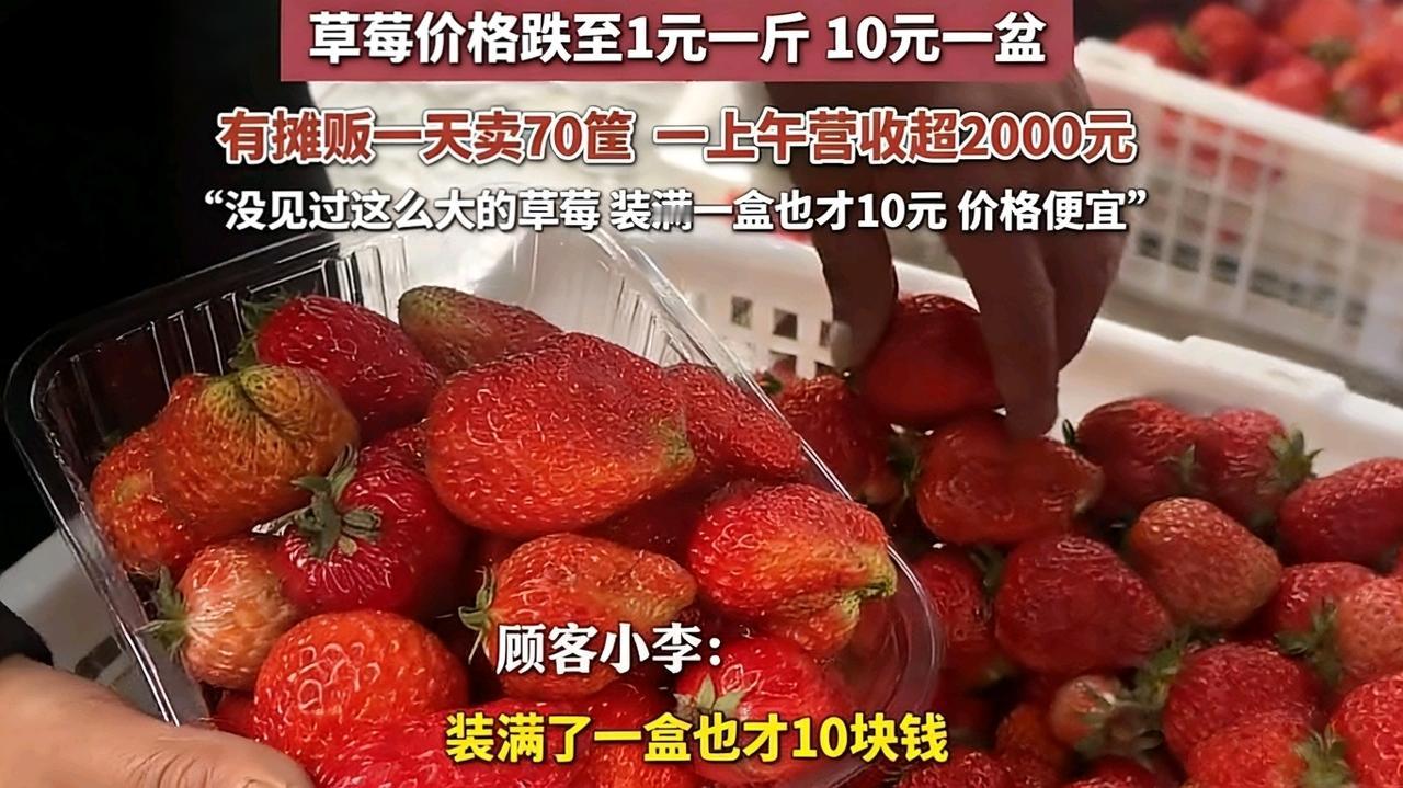 武汉草莓“跳楼价”!1元一斤,10元一盆,网友:实现草莓自由了。 最近武汉的朋友,是不是走路都绕着水果摊走?就怕忍不住抱一堆草莓回家。 没错,武汉的草莓价格直接“打骨折”了!在新华南国际果品市场,个头饱满的红颜草莓,装满一大盒才10块钱,更夸张的是,普通小草莓居然跌到1元一斤,10块钱就能端走一大盆。 顾客小李说:“没见过这么大的草莓,装满一盒才10块,尝了也很甜,这价格太香了!” 这么便宜,商家还能赚钱吗?老板杨先生算了一笔账:“我们按品质分了1元、2元、3元、5元等多个价位,一上午就卖了六七十筐,最大的一笔批发单就有2300元。”隔壁的商贩更猛,一上午直接卖了三四千斤。 为啥突然这么便宜?老板们都说,就是天气闹的。最近武汉阴雨连绵,出来逛的人少,草莓又到了集中上市的季节,再不卖就烂在地里了,只能低价甩卖。 不过,业内人士也说了,这种“地板价”不会持续太久。等天气一晴,出来买的人多了,价格肯定还会涨回去。 现在正是抄底的好时候,武汉的小伙伴们,还不赶紧冲?晚了可就没这个价了! 你那边的草莓多少钱一斤?评论区报个价,让我羡慕一下。草莓估价 五元草莓 平价草莓 车厘子草莓价格 草莓