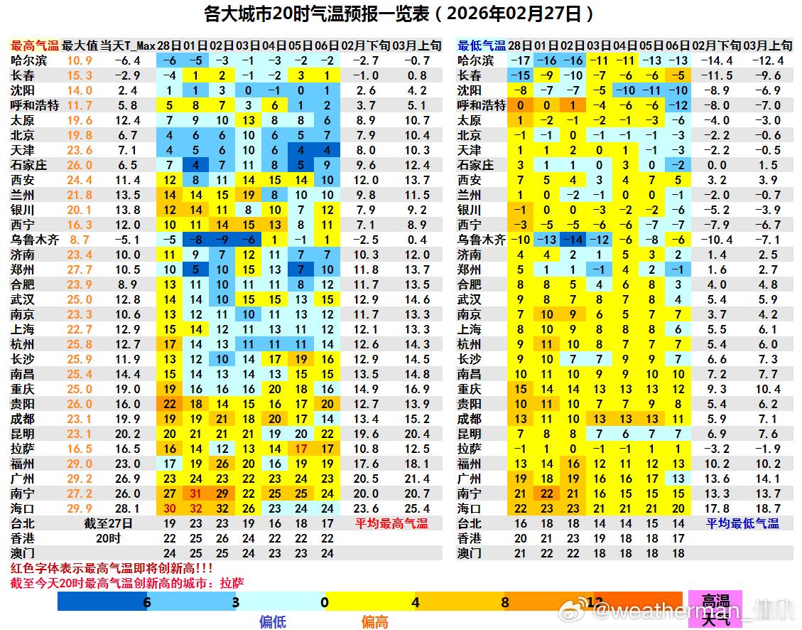 而西南和华南一带,未来总体气温还是偏高。比如成都、贵阳、广州、南宁,未来7天大部分时间气温偏高。今年省会首府城市首个30℃,大概率将在海口和南宁之间诞生。未来2天海口,3月1日南宁都将冲击30℃。