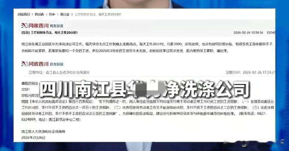 四川一家本地企业给大家解释了,为什么中西部省份的人要去沿海地区打工? 2026年春节期间,高速返程大堵车一再冲上热搜,震撼的车流量画面,让人倍感心酸,最感人的评论就是,“打工的他们,生如草芥,却灿若星辰”。 人们在感叹中西部地区和沿海发达地区之间巨大经济差距的同时,不禁发出疑问,长达十多年的产业转移为什么没有出现根本性改变? 想回答这个问题,并不简单,因为各种因素都有,但是近日四川省南江县一家本土企业却给出了答案,媒体报道,有网友投诉到问政四川,反应当地一家洗涤公司,强制员工上班时间从早上7点到凌晨2点,长达19个小时,月薪只有3000元,无社保,无加班工资,甚至员工提出离职就要扣发整月薪酬。 看看这就是中西部地区一些企业对待员工的态度,试问这种工作强度和工资水平谁还不走?留在当地上班,遭受不公平待遇,留在当地务工的意义在哪里? 背井离乡务工,在江浙沪闽粵等地打工,虽然有心酸,至少能拿到可观的工资,有较为公平的待遇。 四川的这家本地企业,用苛刻的用工待遇告诉了大家,离家出走并不是就那么不好,有时候走出去,反而比待在家里上班还顺气一点。背井离乡务工 打工人迁徙潮 广东打工群体 湖南人深圳打工 南方返乡 异乡务工 各省打工人数 来广东打工族 打工人故乡 打工人迁徙 背井离乡打工仔 南方务工