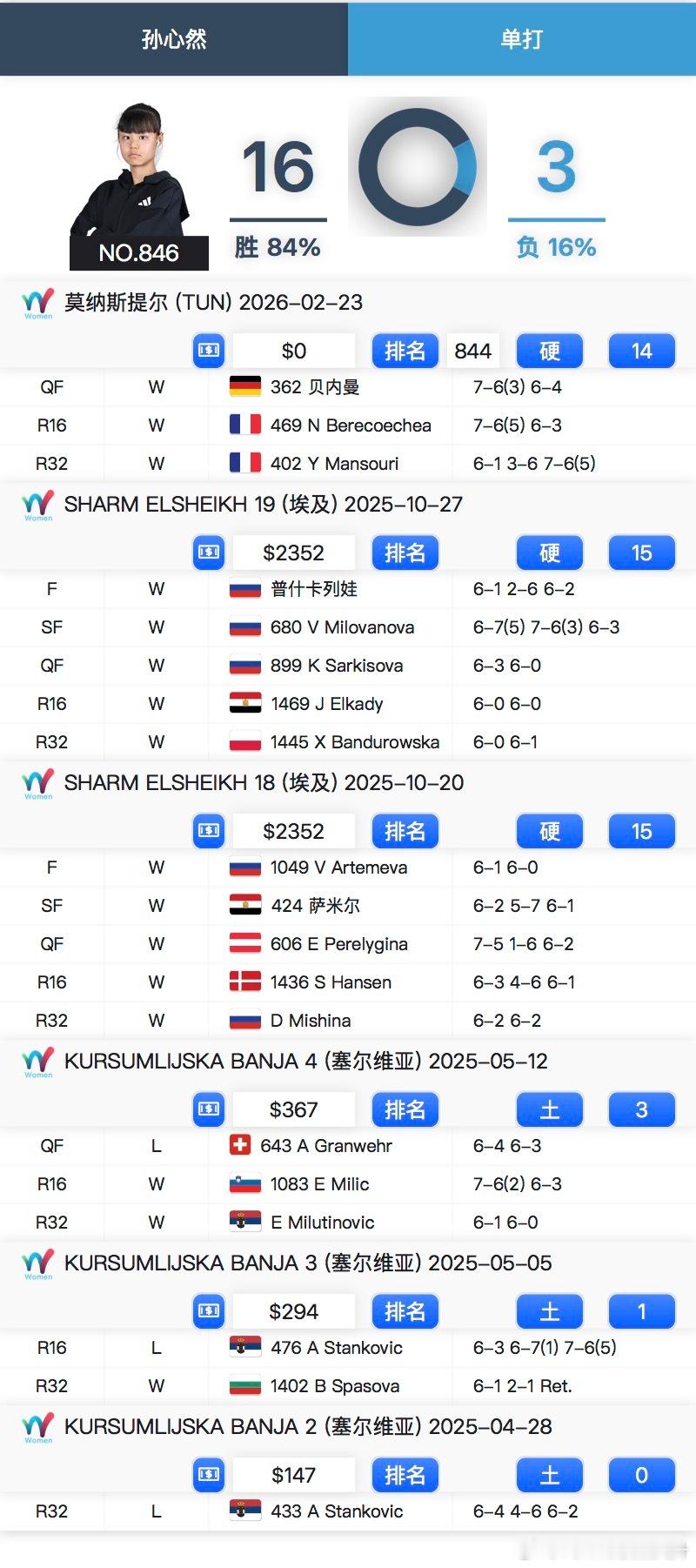 🇨🇳孙心然目前成人赛战绩16胜3负