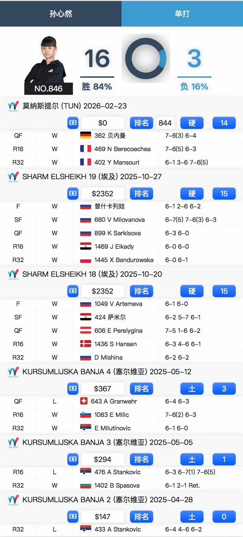 中国16岁网球天才少女惊艳世界,未来成就将不低于郑钦文!ITF莫纳斯提尔W35赛1/4决赛: 孙心然以7-6(3)/6-4击败6号种子贝内曼晋级四强,收获14分,即时排名第760位。对手排名在360左右。 孙心然目前成人赛战绩16胜3负。2025年4月开始打成人赛,收获两个W15的女单冠军,本周是首次参加W35级别的赛事。