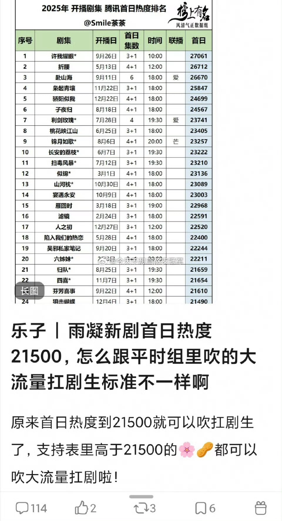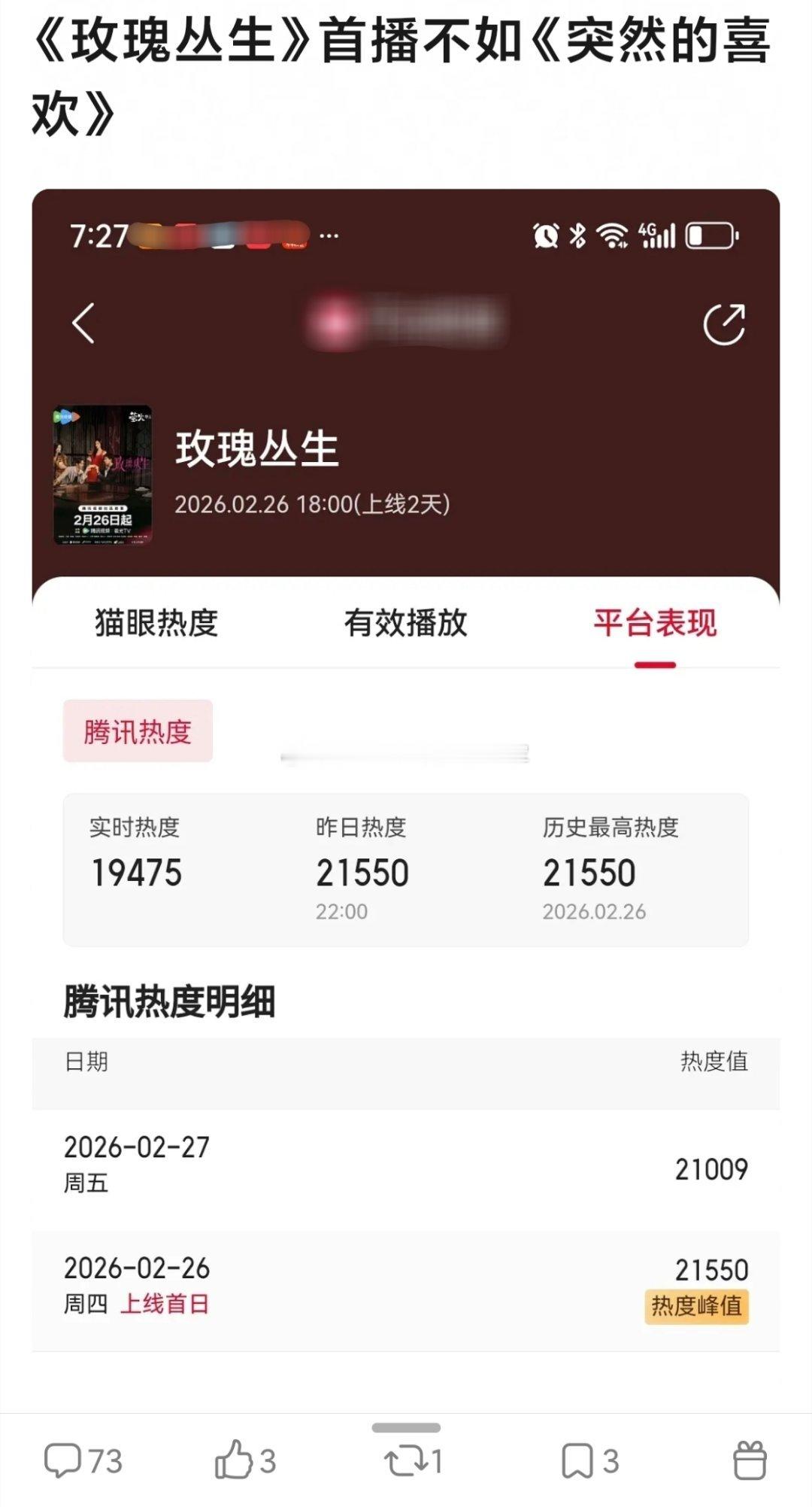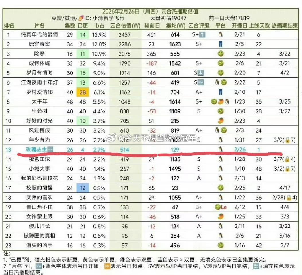 《玫瑰丛生》在有10w座☁️包场和专栏开屏的情况下,首日云🈴占比2.7%都进不了前10。现在瓣人已经褫夺顶刘的“二番扛剧生”花名了李涛,刘宇宁现在的问题是不是脱离不了古偶的大滤镜和扛剧女主?毕竟观众都是看脸的,古偶在妆造上的优势不要太明显。大IP《折腰》和《一念关山》《书卷一梦》都算是百里挑一的好剧本,顶刘快两年没进组,也是在物色更能补齐自己短板的好本子吧王子文刘宇宁的cp感玫瑰丛生