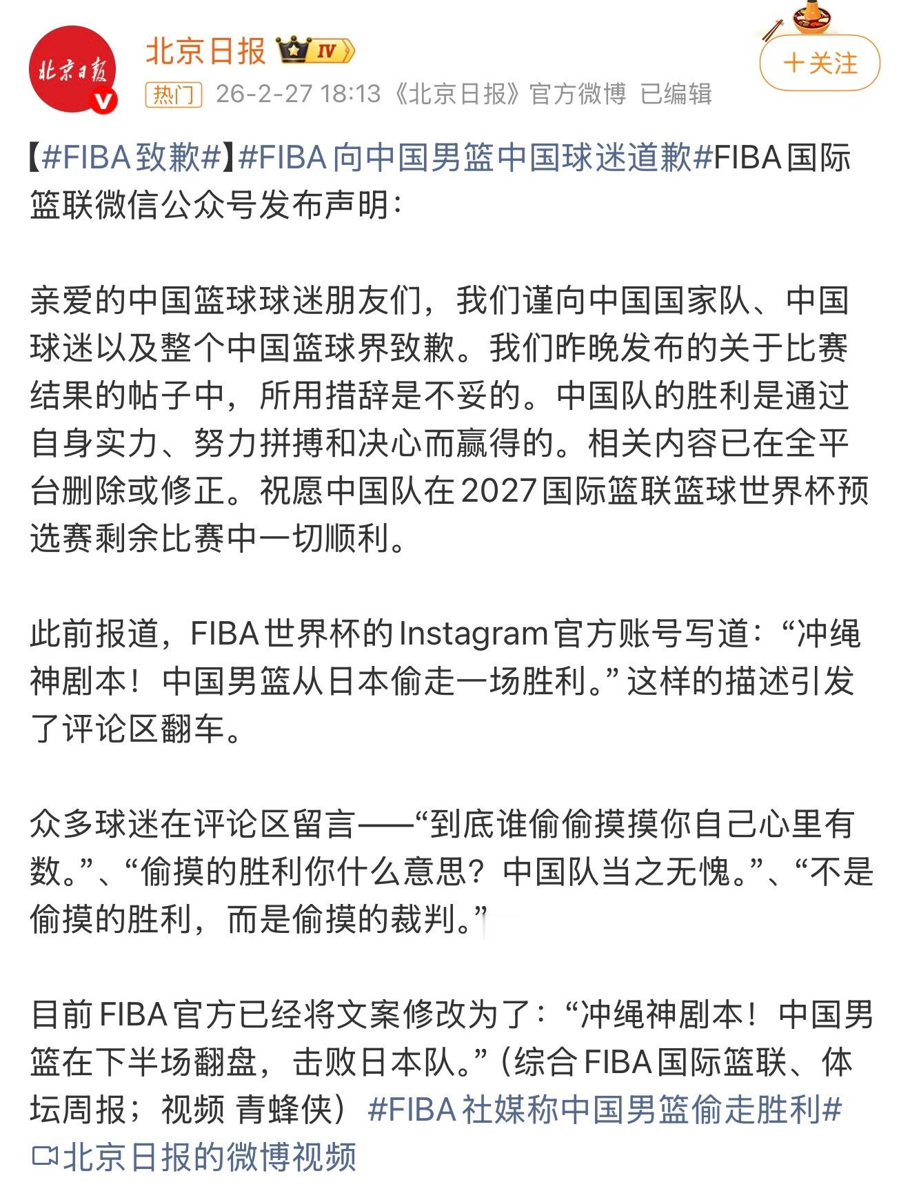 FIBA国际篮联向中国男篮致歉看过昨天晚上那场比赛的人都知道裁判有多黑吧?甚至有人录最后1分钟,硬生生录了20分钟。