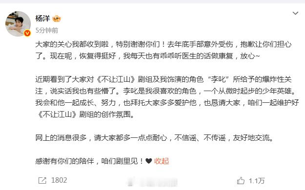 杨洋回应不让江山近期相关争论【杨洋和不让江山剧方同时回应】2月27日晚,发文回应《不让江山》近期相关争论,呼吁大家多点耐心,不信谣、不传谣,友好地交流。对此, 转发并表示:“衷心感谢每一位观众朋友对《不让江山》的关心与监督,我们会和艺人团队继续保持积极沟通,谨遵医嘱并合理安排杨洋先生的拍摄计划。我们也将对大家关注的问题持续跟进和调整,希望能用踏实认真的拍摄回报每一份关注与期待,让我们和李叱剧中相见❤️”杨洋不让江山造型路透