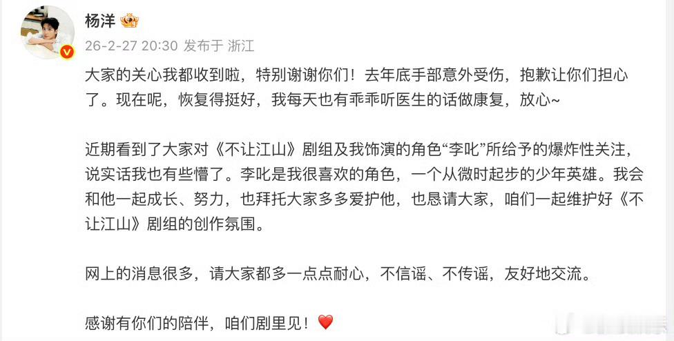 杨洋回应不让江山争议不让江山剧组回应杨洋 27日,《不让江山》新路透曝光,杨洋的手好肿引发热议。刚刚,杨洋发文报平安感谢大家关心,并表示恢复得挺好。对于《不让江山》相关争议,他表示李叱是自己很喜欢的角色,会和他一起成长、努力,也拜托大家多多爱护他,“网上的消息很多,请大家都多一点点耐心,不信谣、不传谣,友好地交流。”随后,转发回应,会和艺人团队继续保持积极沟通,谨遵医嘱并合理安排杨洋的拍摄计划,也将对大家关注的问题持续跟进和调整。