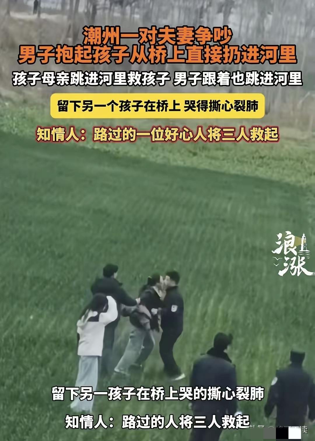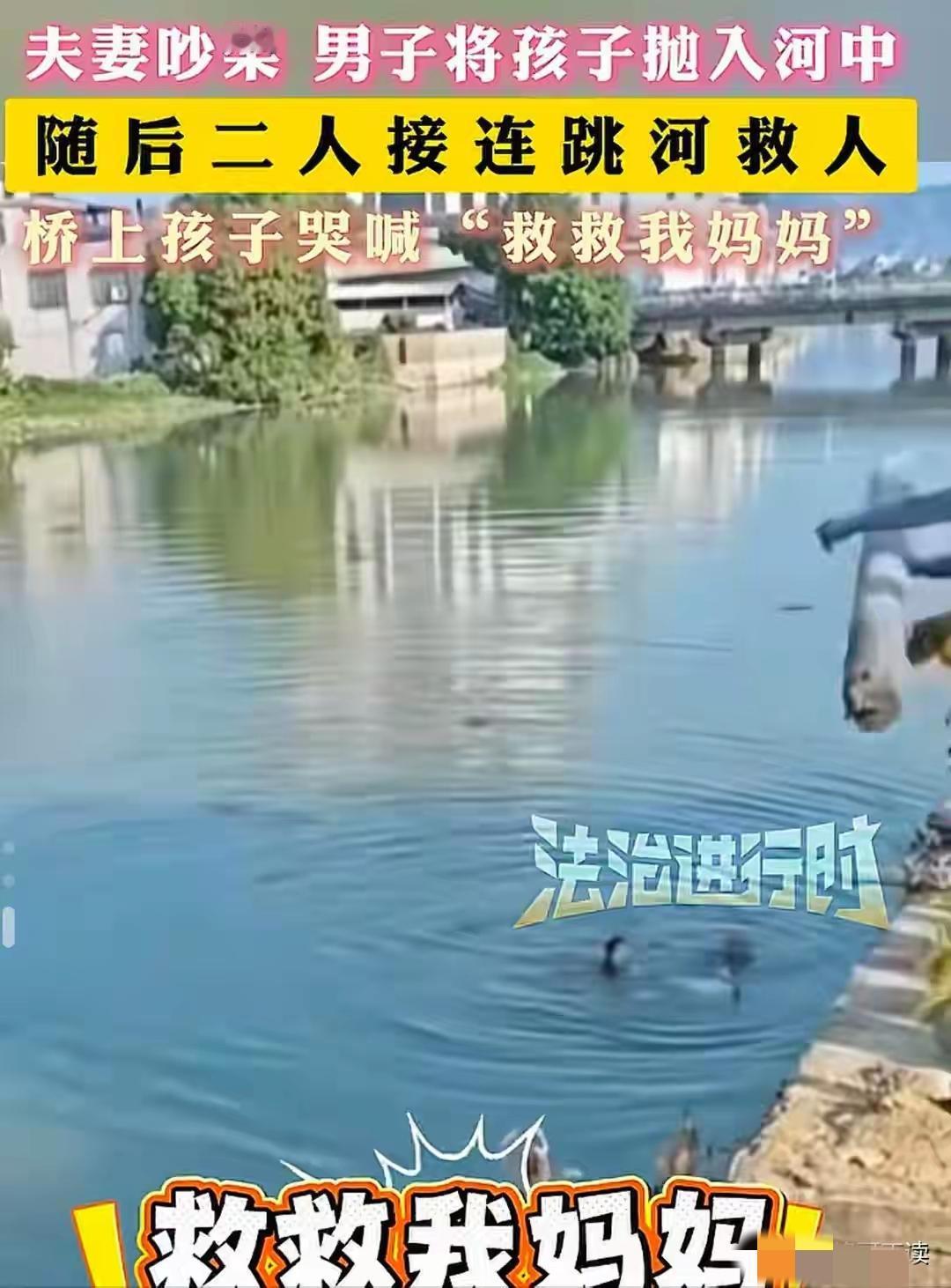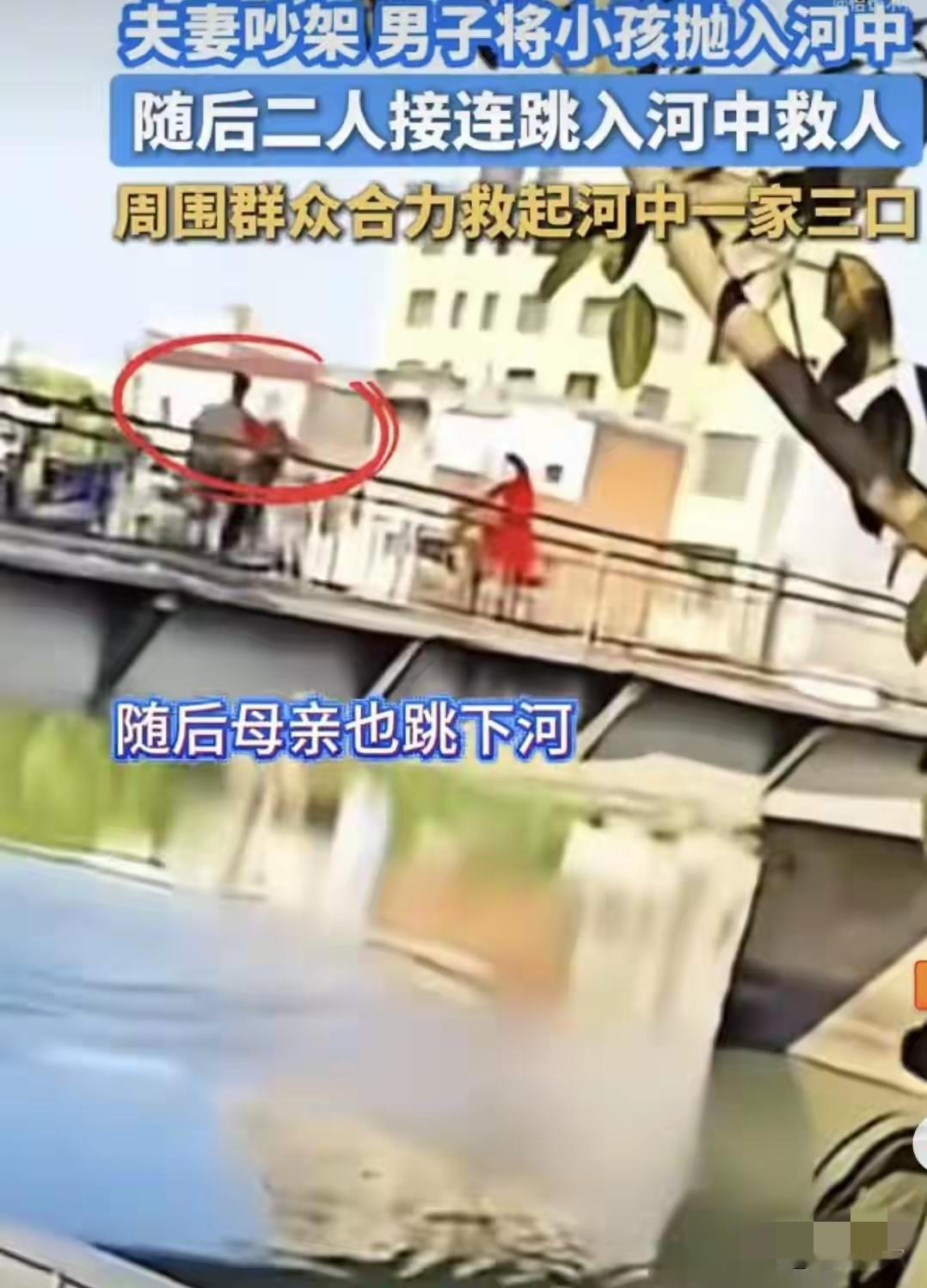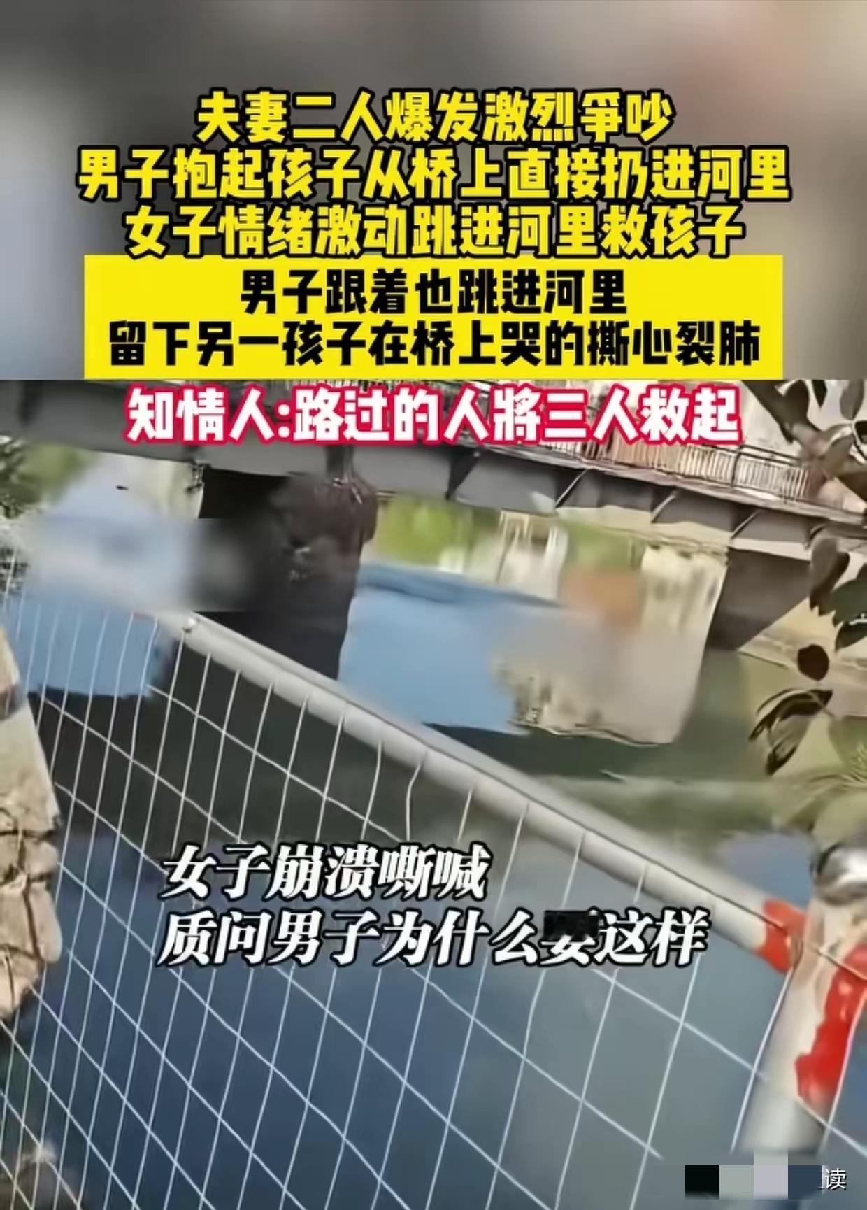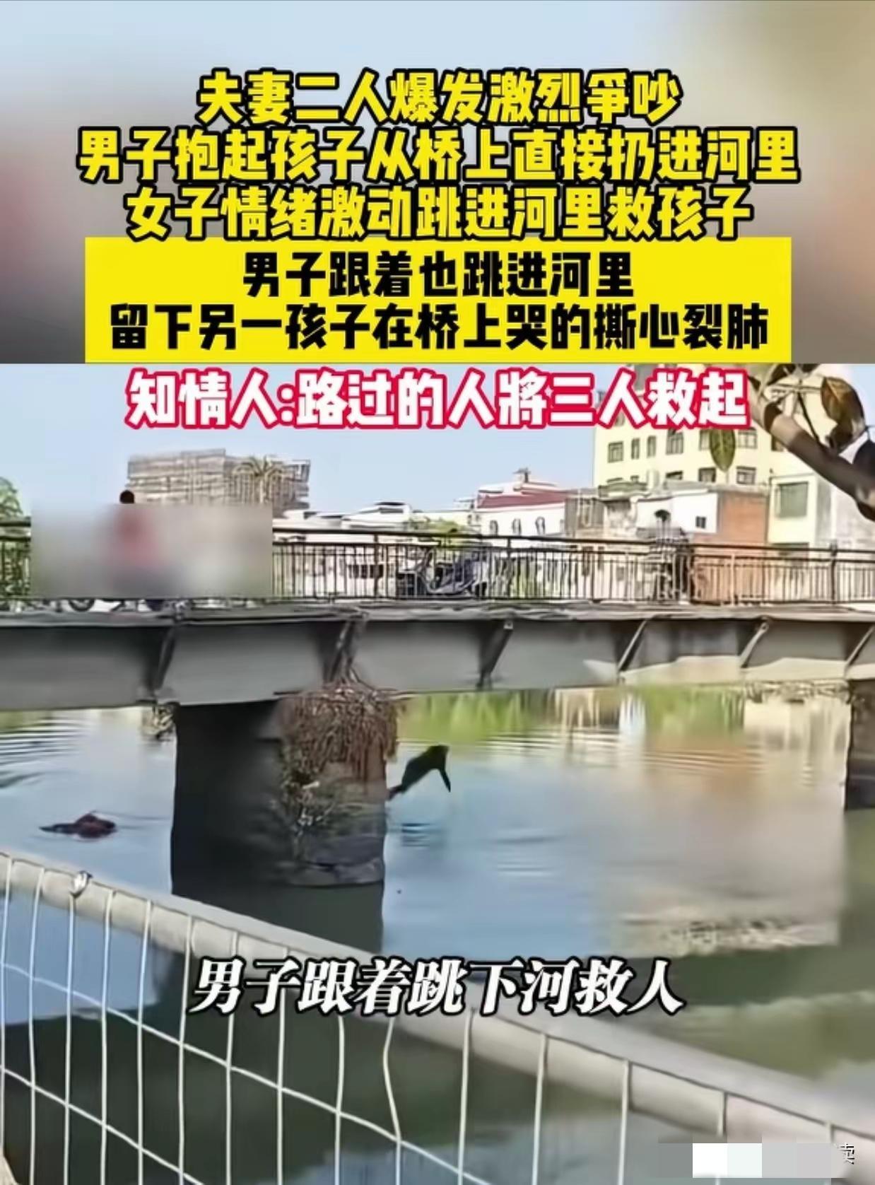 一家4口,夫妻二人在桥上领着俩孩子爆发激烈的争吵,突然间,男子抱起几个月的婴儿,从桥上直接扔到河里,速度快的妻子都来不及反应。 谁也不知道这个父亲是抽了什么疯,居然把自己的亲生孩子扔到了河里。 孩子还是几个月的小婴儿。 那个男的当着老婆的面,当着5岁大儿子的面,当着桥上那么多路人的面,双手举起怀里那个还在哭的小婴儿,眼神发狠地就把他往桥下河里一扔! 这个时候,这妈妈惊呆了,都没有考虑,就跳下了河。 这男子也让自己的行为吓了一跳。 他的脑子空白了一霎那。 5岁的儿子在桥上哭着要妈妈,要路人:救救我妈妈。 爸爸把几个月的婴儿扔下了河里。 妈妈质问:你为什么要这么做? 妈妈没有考虑直接救孩子,母爱天性,看着婴儿入水的一霎那,妈妈赶紧跳下去救孩子。 爸爸迟疑了一下,也跟着这妈妈跳下去了。 留下5岁的孩子在桥上瑟瑟发抖的大哭不止。 三口跳入河中,只有儿子在大桥上哭着:救救我妈妈,救救我妈妈。 ……。 最新后续来了。 三人落水后,路过的路人,都伸出来援助之手,救了他们。 这些人毫无顾忌的跳进冰冷的河里,齐心合力把这三人救上岸。 网友说:太狠了,你们夫妻吵架,爸爸竟然敢拿孩子性命撒气。 是啊,这个爸爸的行为,让人心里害怕。 老话说的好,虎毒不食子,这个爸爸的行为,不单单他“失德”,这么简单。 网友说:不管什么原因,这男人对亲生幼子下如此毒手,都不应该逃脱法律的制裁。 是啊,普通不过的家庭矛盾,差一点酿成悲剧。 这一家人,外地来揭阳打工的。 日子不算富裕,可是生活琐事,经济压力,带娃太累的事实。 让这小夫妻吵架了,男的当天喝酒了,酒精让他把情绪放大到极致。 让他干出来这样如此愚蠢又冲动的行为。 这可不是普普通通的夫妻吵架,这是把婴儿往死路上逼。 这个行为可是违法行为。 孩子是无辜的,再怎样也不能拿孩子撒气,更不能伤害孩子。 有个这样的爸爸,这孩子也是不幸的。 不幸中的万幸,孩子妈妈还是比较靠谱的妈妈。 希望这个妈妈,能够看到自己到底找了一个什么老公? 希望这俩孩子,早日走出这个阴影。 [祈祷][祈祷]希望孩子妈妈好好爱这两孩子。 稚子无辜,他们不是我们成年人的出气筒,他们是需要我们爱护的人。 朋友们,你们说这个妈妈会原谅这个爸爸吗?