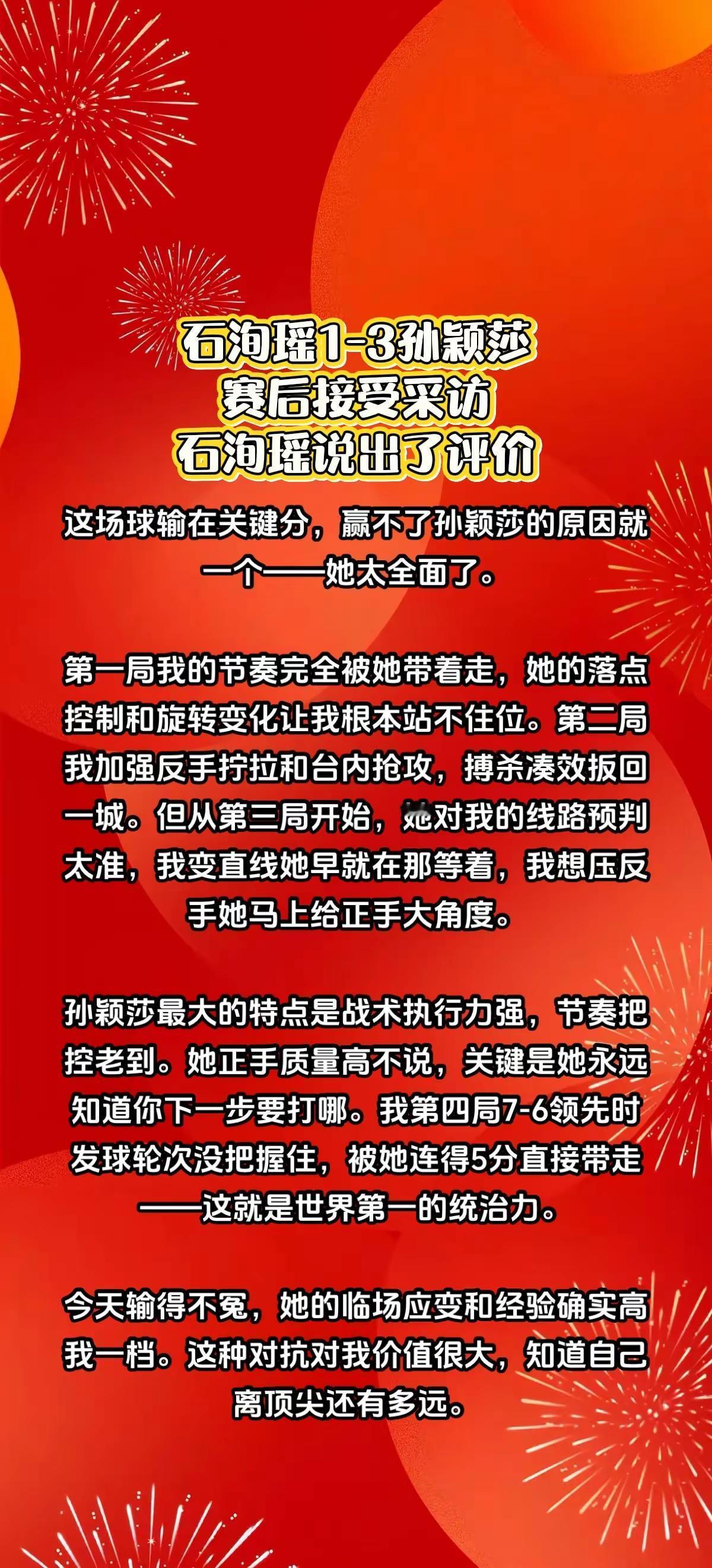 石洵瑶1-3孙颖莎,赛后石洵瑶说出了评价。孙颖莎