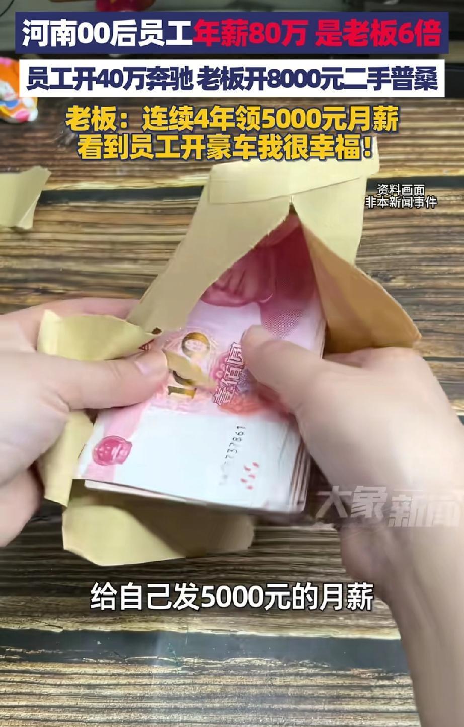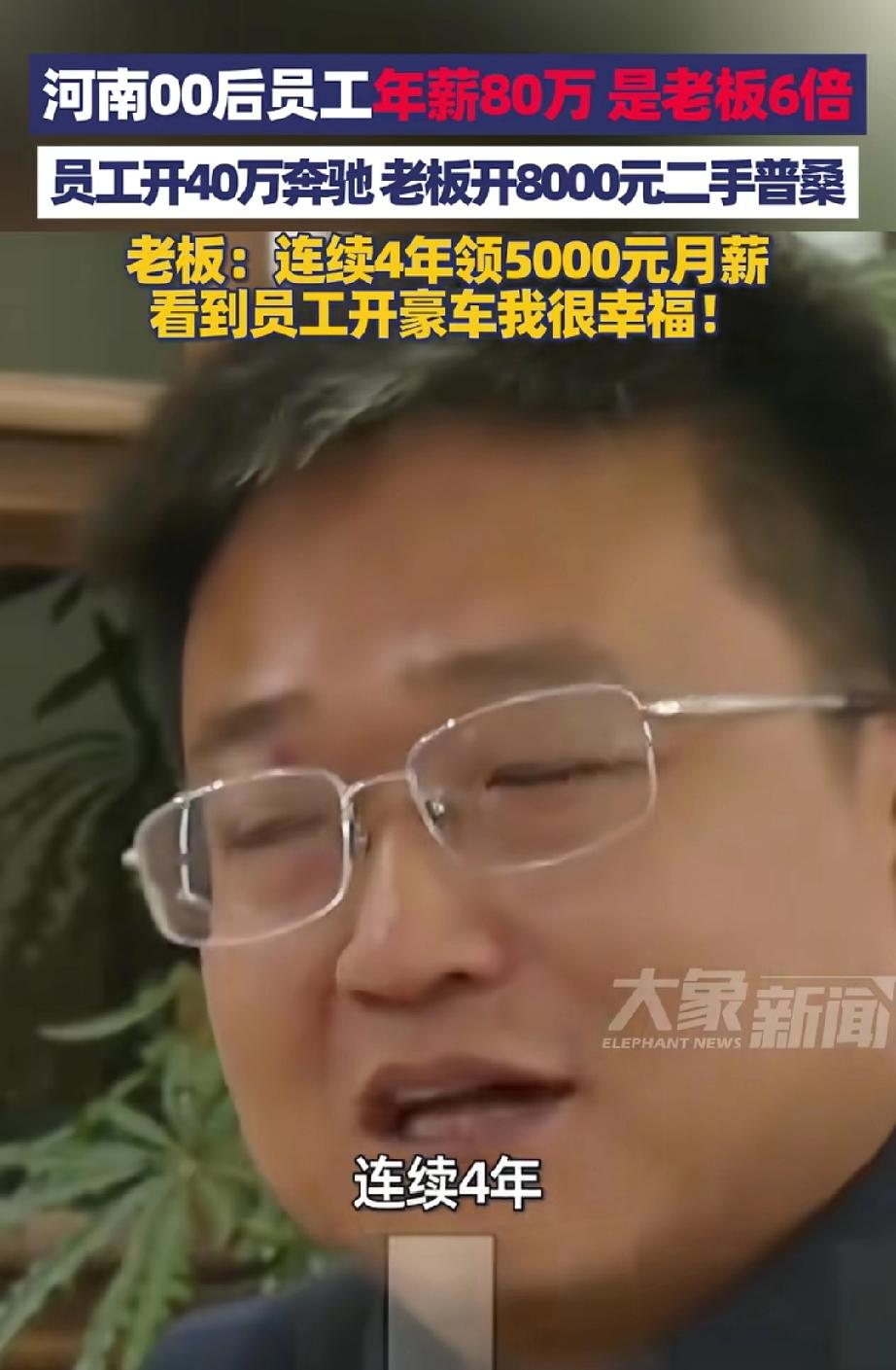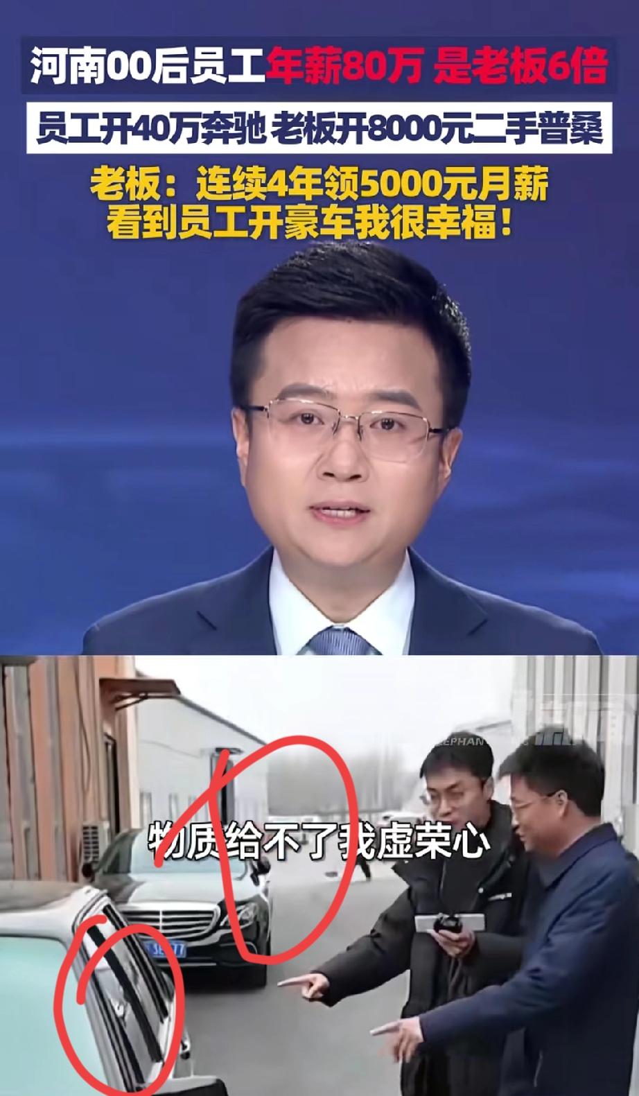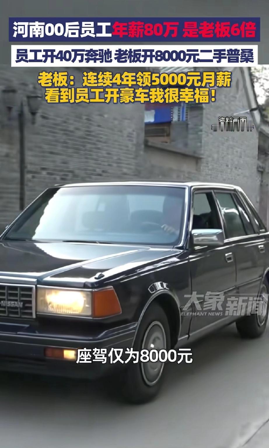 羡慕哭了!河南濮阳,00年的小伙在一家公司工作仅3年,年薪就高达七八十万,开着40万的奔驰上下班;而他的老板,座驾竟是花8000元买的二手普桑,每月工资5000元,员工年薪是老板的6倍,网友直呼最良心老板! 视频里,那位00后小伙拍着自己的奔驰,骄傲地说:“这是我的豪车。” 旁边的老板呢,指着那辆破普桑,笑着说:“我这车是8000块钱买的。” 更让人不敢相信的是,这位老板给自己发工资,连续4年每月只拿5000块。而那位00后员工,一年能挣七八十万,是老板的6倍多。 老板坐在那辆寒酸的普桑里,看着员工开奔驰,不但不眼红,反而笑得合不拢嘴!很多人第一反应都是:这老板是不是傻? 老板指着自己的普桑说:“我是不太需要这些物质的东西去衬托,我感觉啊,它也给不了我信心,也给不了我虚荣感。” 然后他扭头看着员工的奔驰,眼睛一亮,说了一句掏心窝子的话:“看到他们开豪车,那幸福!” 最后,他透露了自己的工资:“我们公司从创业以来,前四年我给自己只发5000块钱工资,现在好了,我给自己发1万块钱工资。我没有从公司拿走我一分钱。” 咱普通打工人,每天起早贪黑干活,图的啥啊?不就是图一份公平,图自己的努力能被老板看见,图付出能有实打实的回报吗? 现实里,多少老板自己开豪车住豪宅,赚得盆满钵满,却让员工拿着死工资熬日子,画着永远兑现不了的大饼,干多干少一个样,努力全白费。 最好的职场关系,从来都不是老板一个人赚钱,员工勉强糊口;也不是员工浑水摸鱼,老板独自操心。 而是老板懂惜才,舍得给员工回报,员工懂感恩,愿意为公司拼命,你懂我的辛苦,我懂你的不易,彼此成就,双向奔赴。 就如这个老板说的,我不盯着员工干活,迟到了,可能是家里有事儿,尊重员工,让他有好心情,效率才能最大化。 这个社会,精明的老板太多,愿意“吃亏”的老板太少。他让我们相信,真正有大格局的人,把别人的幸福,也当成自己的荣耀。 00后员工年薪80万 是老板的6倍
