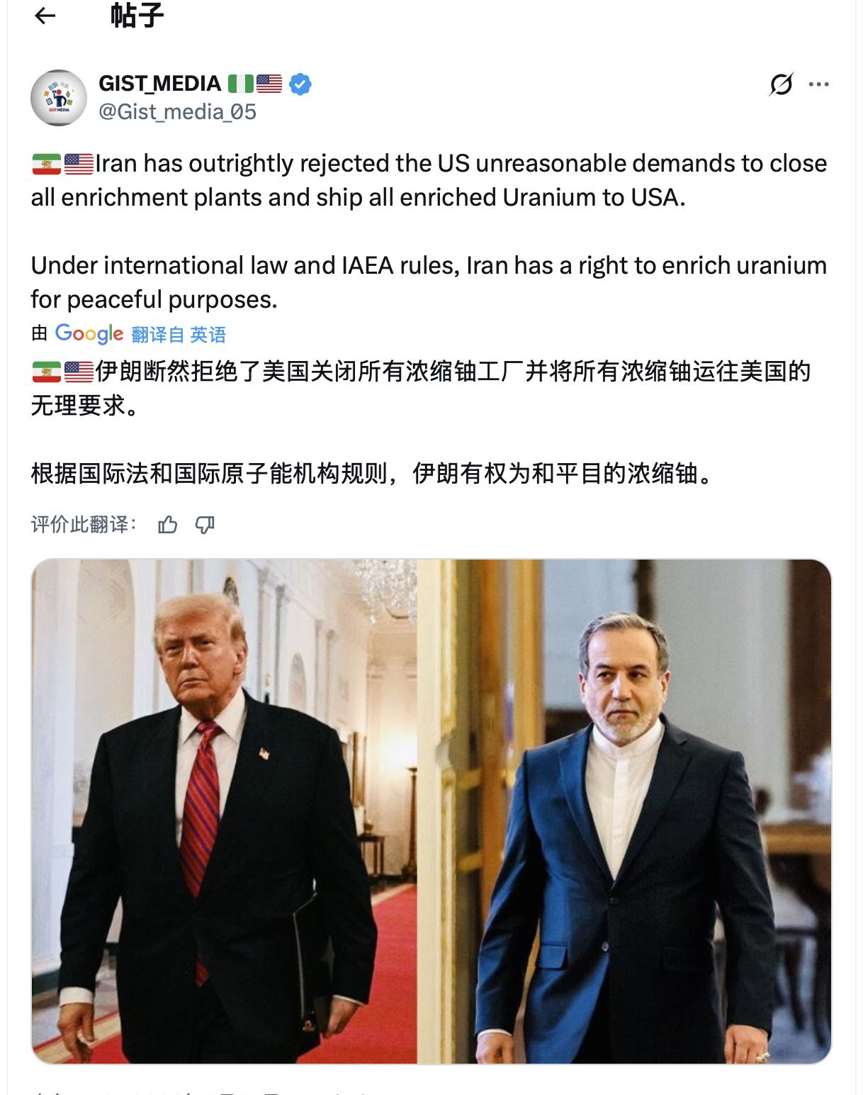 谈崩了!根据《华尔街日报》和美联社对今天日内瓦会谈的报道,伊朗拒绝了美国提出的摧毁福尔多、纳坦兹和伊斯法罕核设施、将所有浓缩铀移交给美国、永久停止浓缩铀活动以及接受一份永不过期的协议的要求。 战争的脚步临近了。。。