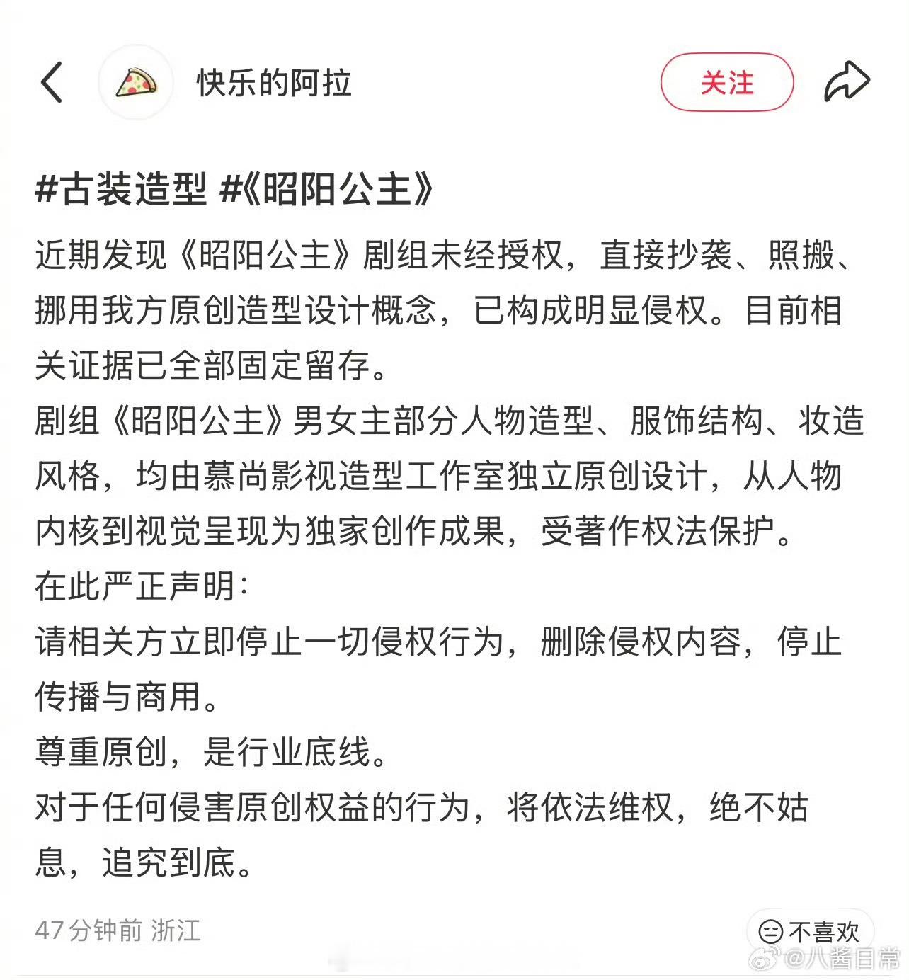 李宏毅,孔雪儿《昭阳公主》被指控造型抄袭,维权方表示一开始和剧组合作提供造型设计,后来因为一些问题合作终止,剧组表示不会用他们造型,结果开机后发现造型只是小改了一下,维权方要求剧方停止侵权行为