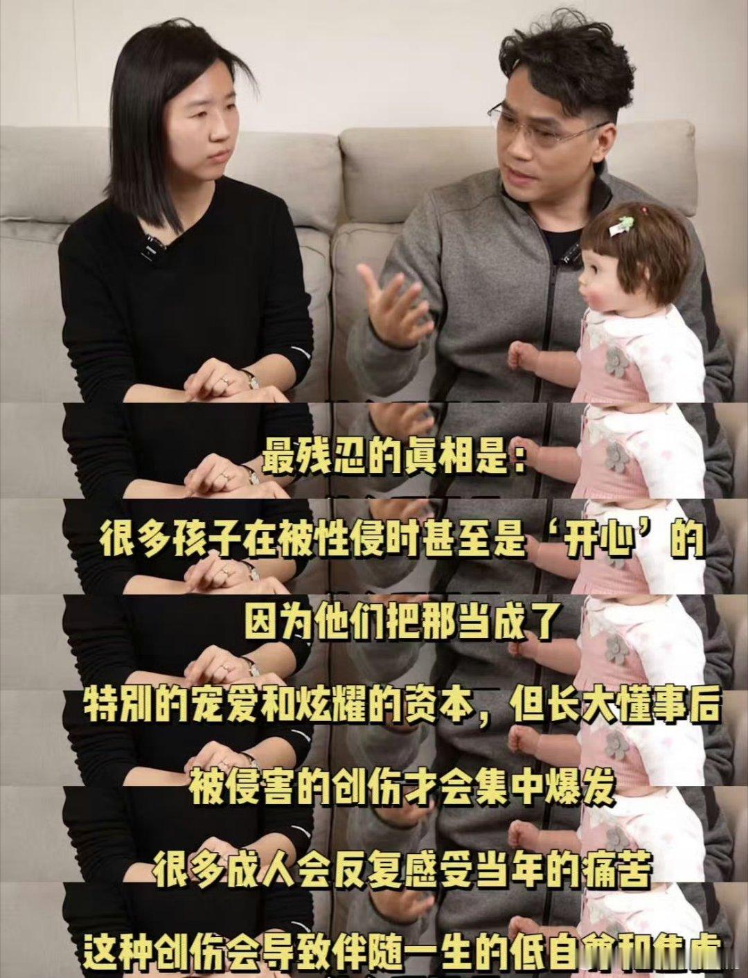 看完这期访谈,我给我妈打了个电话。我说妈,以后别亲孩子嘴了。我妈说怎么了?我说你看这个访谈,很多侵犯就是从“正常的亲密”开始的。第一次亲脸颊没事,第二次伸舌头孩子也不知道有什么不对。我妈沉默了。我说咱们这代人没学过这些,但孩子需要学。不是我们不爱孩子,是我们不知道爱的方式可能变成伤害的入口。我妈说好,以后注意。我想,这就是这期访谈的意义吧。让更多人知道,让更多人注意,让更多孩子不用因为大人的“不知道”而受伤。男孩被侵犯4年以为是游戏