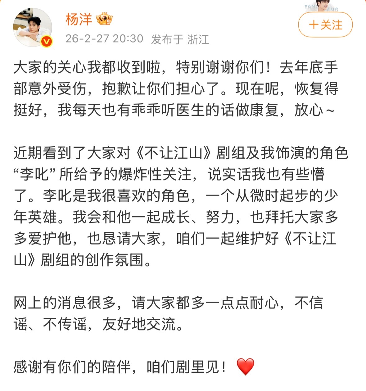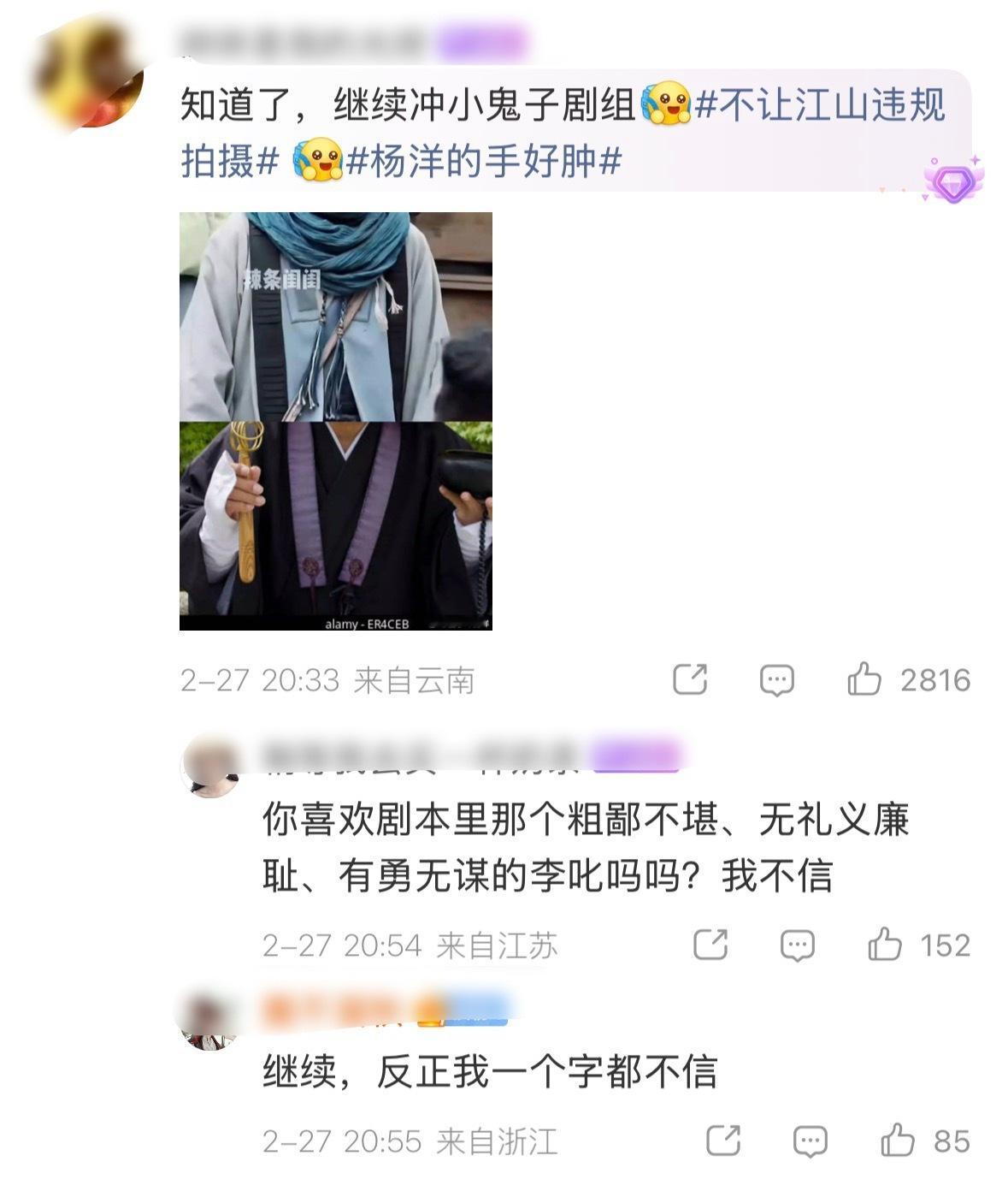 这下是真玩脱了,真控不住了,杨洋“背刺”粉丝紧急出来急刹车了,呼吁粉丝维护剧组创作氛围。应该是被平台高层约谈让出来安抚粉丝情绪,结果评论区还这样魔怔,根本不信。。。杨洋发文回应不让江山争议