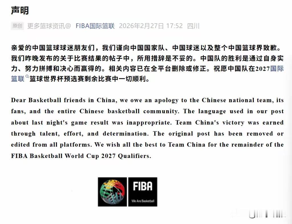 国际篮联终于道歉了!中国男篮的胜利,从不是“偷来的”,是拼来的! 中国队87:80逆转战胜日本队,国际篮联官方账号写道:“中国男篮从日本偷走一场胜利”。这引发了中国球迷的强烈愤慨,国际篮联随即发布致歉声明。 “我们昨晚发布的关于比赛结果的帖子中,所用措辞是不妥的。中国队的胜利是通过自身实力、努力拼搏和决心而赢得的。相关内容已在全平台删除或修正”。 国际篮联赛后用“偷走胜利”形容中国队,不仅否定了中国男篮在冲绳15分大逆转的拼劲,更无视了队员们顶着争议判罚的坚持。同时更背离了国际体育组织的中立原则。 国际篮联不当措辞实属不该,致歉是必然,更要记住:体育的本质,是尊重每一份努力与汗水! 中国男篮 男篮新名单 男篮亚预赛 世界男篮排名