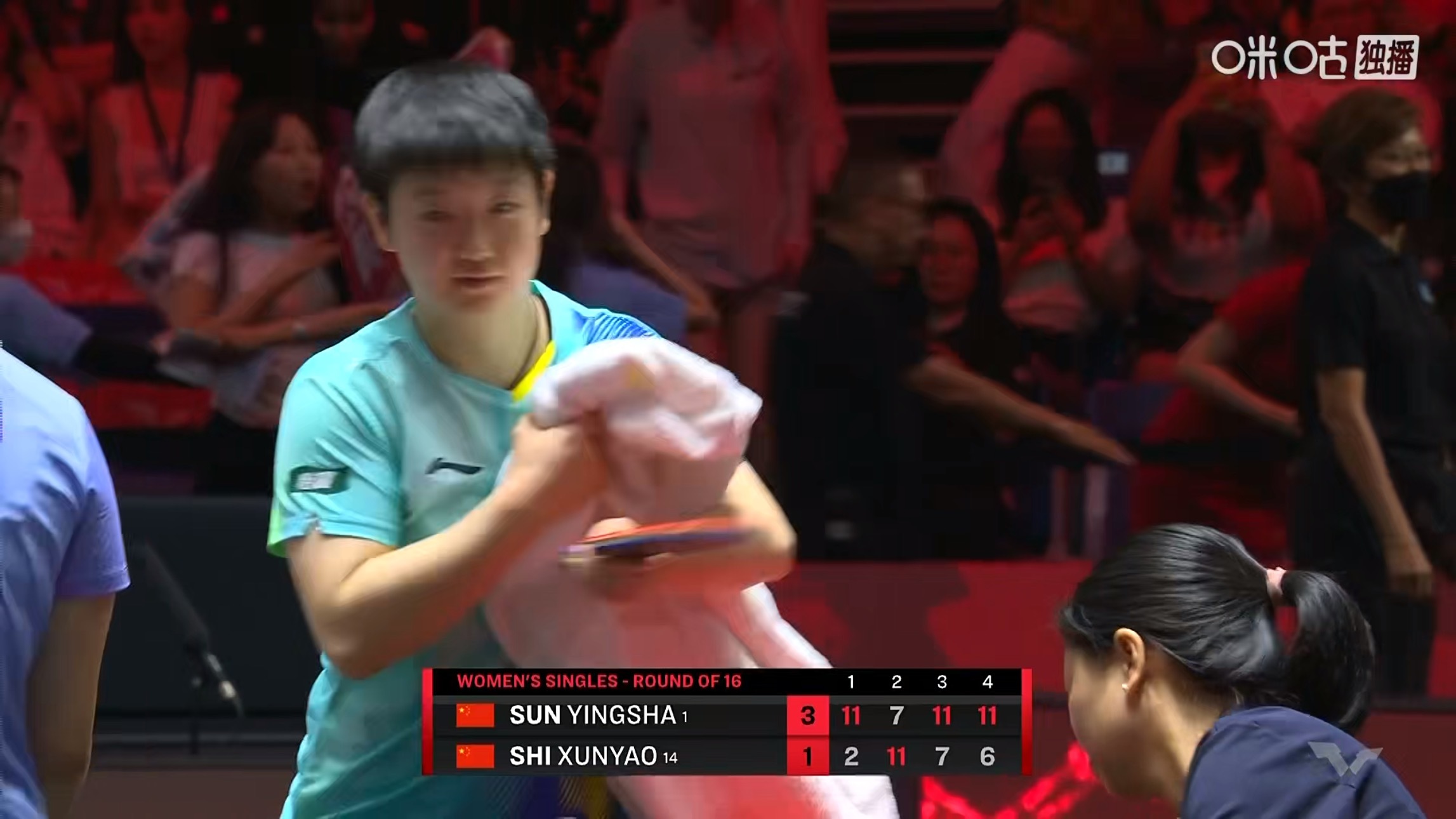 孙颖莎3比1石洵瑶(11-2,7-11,11-7,11-6)晋级WTT新加坡大满