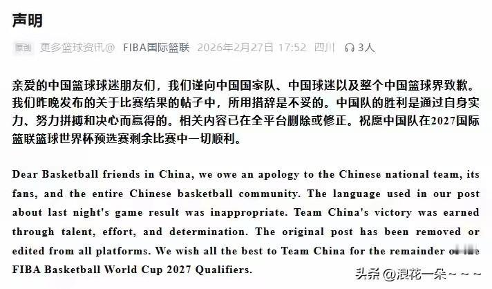 就在刚刚, 国际篮联向中国球迷,中国🇨🇳人民,中国国家队道歉了。 话说,这个国际蓝联真丢人,真不知道天高地厚,真没有宣传水平,我早晨看到那个“偷”字,我就感觉不对劲。原来已经是惹的中国球迷早就生气了。 现在国际篮联站出来道歉了,窝了一肚子火一天多了,也算是给咱消消气吧! 不过,这事儿就一个道歉有点太简单了,先给他记上一笔吧。