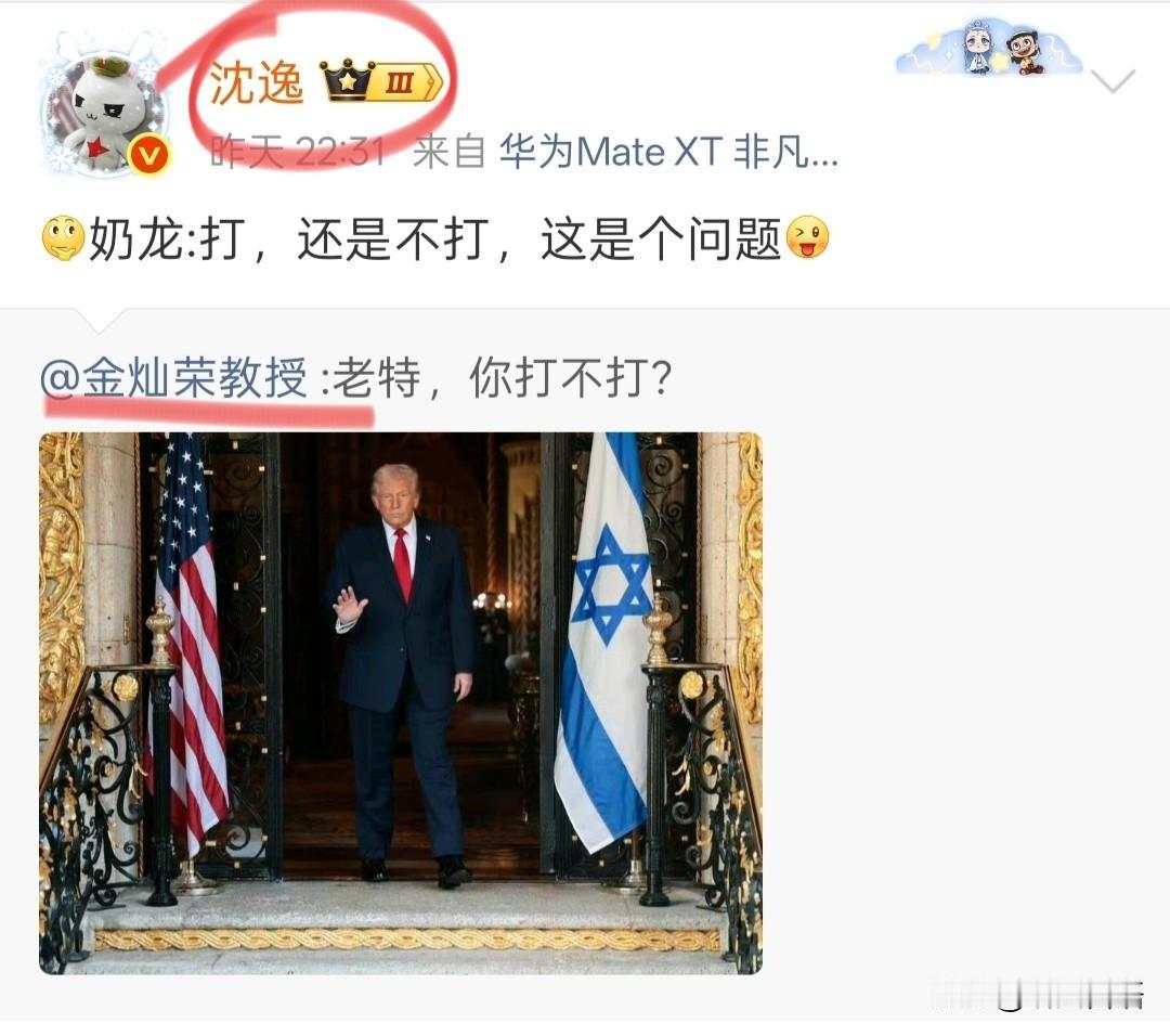 沈逸老师和金灿荣教授都等的不耐烦了,气氛都烘托到这份上了,不打你让黄金怎么想,原油怎么想,大鹅怎么想,全球吃瓜网友怎么想。老特你到底是打还是不打啊?给个痛快嘛,都急死了!苑举正教授还等着开香槟庆祝🎉呢,还等着穿红衣服上节目呢。 估计这会老特也是热锅上的蚂蚁。打,容易露馅; 不打,牛逼已经吹出去了。不过我猜,老特一向是个奇才,肯定有让大家想不到的招[偷笑]