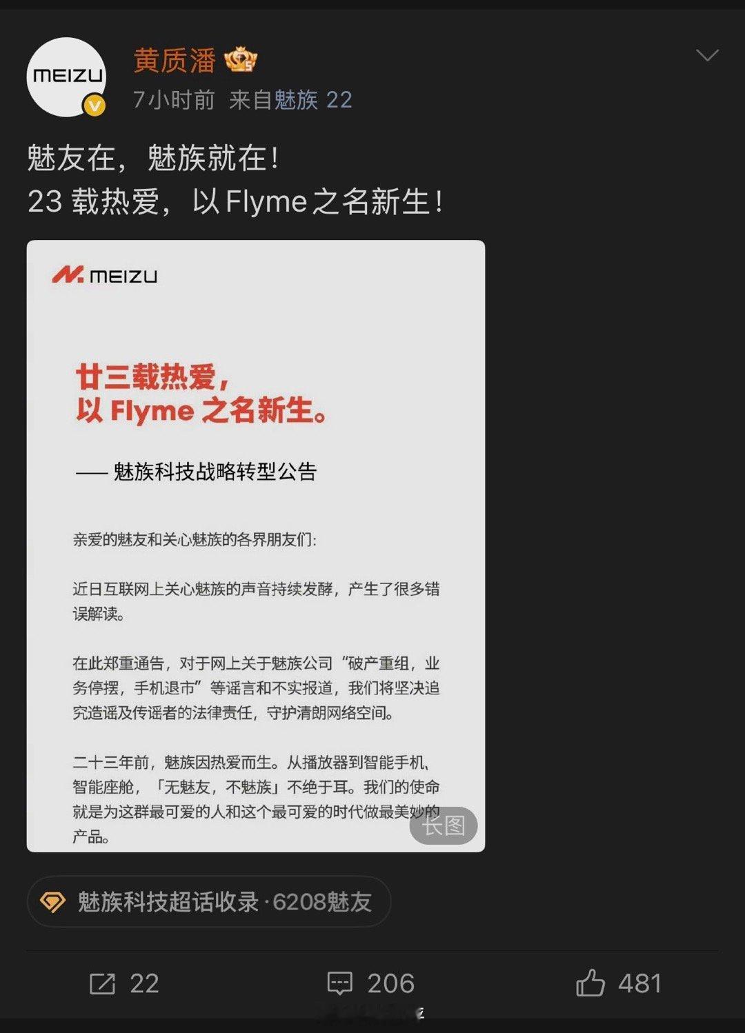 魅族CEO回应:魅友在,魅族就在!23 载热爱,以Flyme之名新生!