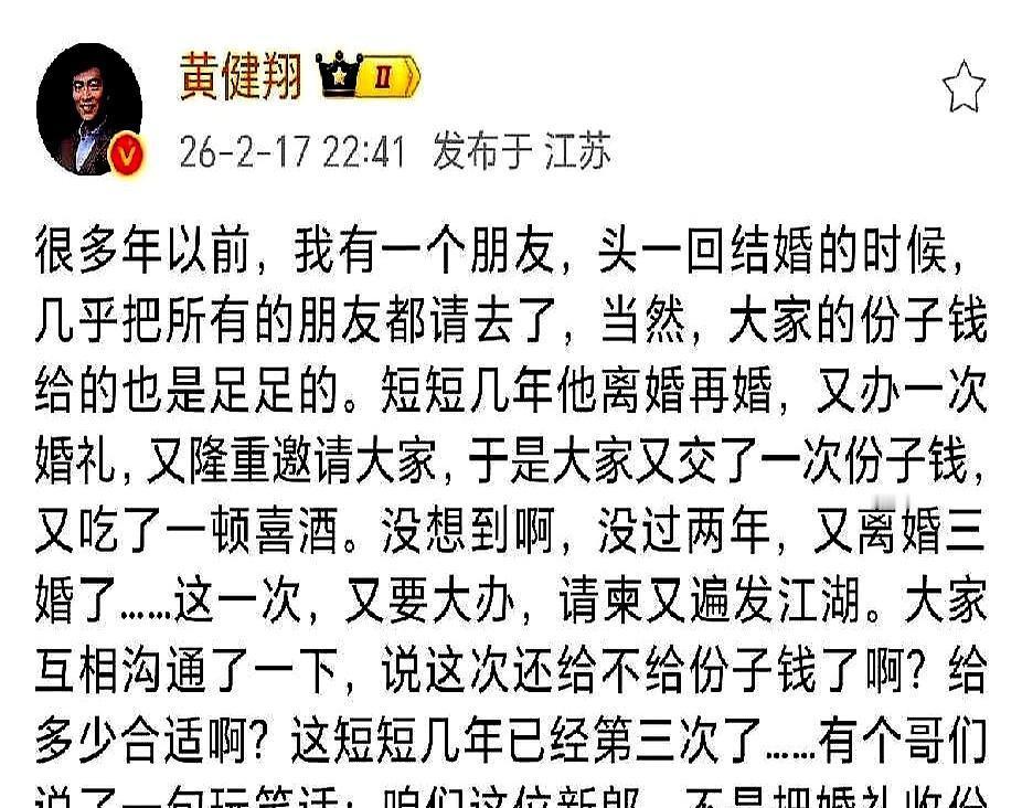 黄健翔拍着大腿喊:“徐亮第三次办大事,我又得掏钱!”满桌酒杯都停了。 董路当场就呛他:“老黄,你这叫不懂人情世故。”旁边有人跟着叹气,说这年头随礼随得肉疼,五百一千地往外掏,都快成月供了。可另一头有人闷了口酒,说亮哥开口叫你,认的是当年那份交情,不是看你红包厚不厚。 人情债最是难还,却也最不能算。它不是买卖账本,而是散伙后还能约酒的底气,是落魄时能开口的勇气。份子钱掏的是钱,买的却是江湖一盏灯。 你上次为份子钱心疼,是什么时候?
