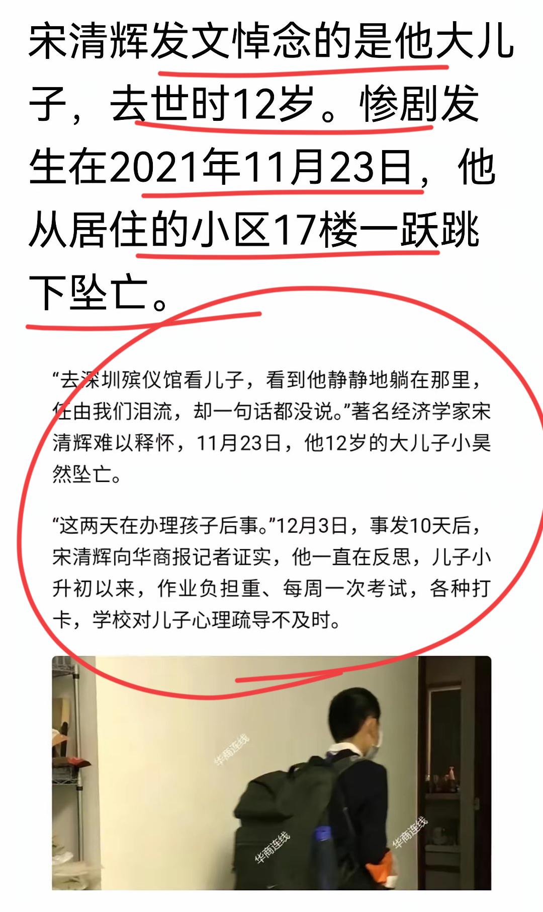 著名经济学家宋清辉老师,再次发文怒批应试教育!!他表示,只要应试教育还存在,上升通道必定收窄,以后,寒门就再难出贵子了!!他呼吁,要及早进行调整,这是对孩子的未来负责,也是对他们未来经济发展和活力负责! 宋老师推荐的是快乐教育,开开心心,轻轻松松,又能把学习搞好不好么? 这样培养出来的都是理论和实践俱佳的高手! 宋老师为何要每天痛批应试教育呢??最重要的一个原因是,他认为应试教育害了他儿子,一个天才画家,从此消失了,就给他无尽的伤痛!他儿子小升初后,学习压力巨大,12岁的一个清晨,就决绝地离他而去~ 他每天发文纪念,4年多了,一天不落,已经发了1500多篇文章,宋老师还保留了他儿子的一切,他的1000多幅高质量的画作,他的衣物,毛发,甚至是一瓶尿液~他感觉他儿子还会回来!太悲伤了! 宋老师认为,这一切都是应试教育造成的悲剧!我要呼吁,他要呐喊! 这觉得这个悲剧,到底是怎么造成的?都是教育的锅,家长没有一点责任么?? 你有何看法呢?