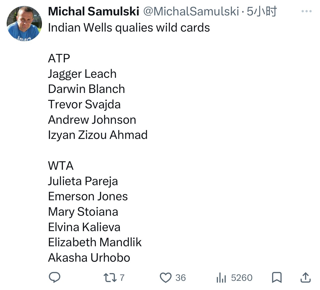 印第安维尔斯大师赛公布外卡归属。