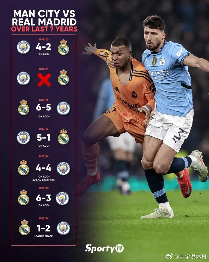 曼城连续5年欧冠战皇马近7年遭遇6次!皇马曼城欧冠历史交手15场,淘汰赛皇马4胜曼城2胜。