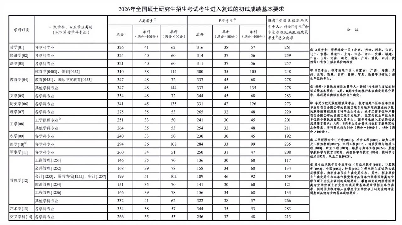 2026考研国家线出炉变化不大与去年相比上午5分浮动。 学术性型A区硕士学哲学提升5分,法学降低2分,教育学三类提升6分,文学提升3分,历史学提升5分,农学降低5分,工商管理降低5分,公共管理提升4分,艺术学提升3分,交叉学科提升6分。 B区硕士分数与A区降升保持一致,整体提升较大的教育学三类和交叉学科超去年6分,哲学和历史学超去年5分,农学整体比去年降低5分。2026年考研国家线