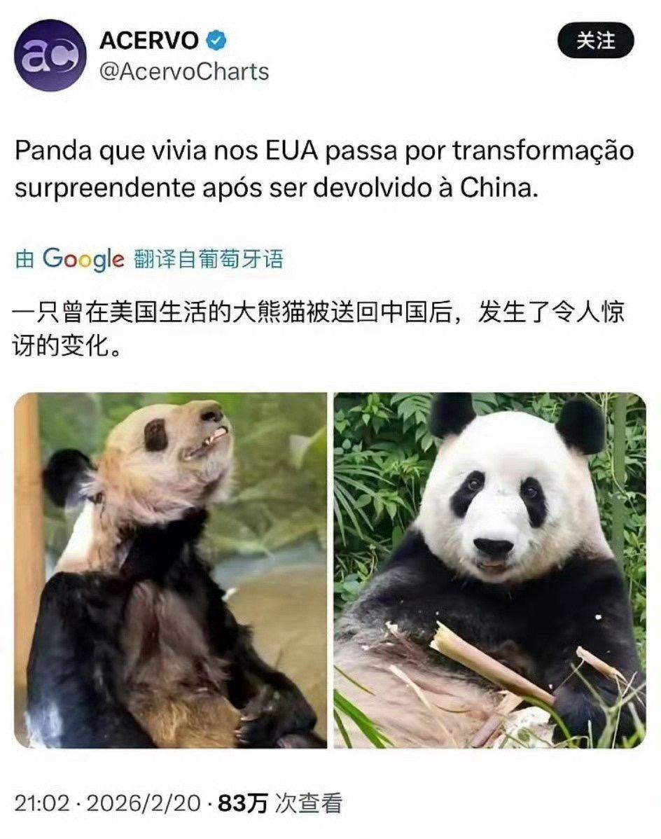 外媒惊叹:一只曾在美国生活的大熊猫被送回中国后,发生了令人惊讶的变化。 因为祖国及时出手,把它从斩杀线上救了回来。 曾经在美国孟菲斯动物园,过得怎一个惨字了得!身体都瘦成了皮包骨头! 但丫丫回国后,不仅吃胖了,精气神也变得非常好,跟之前简直完全两种模样。 前后判若两熊!
