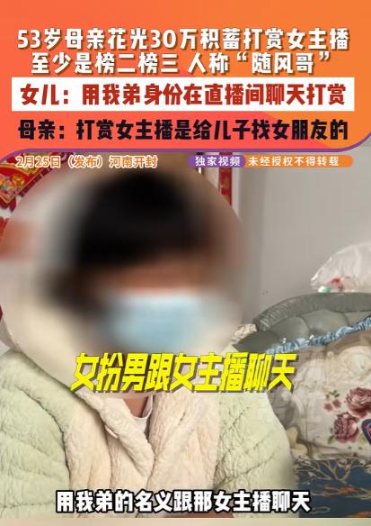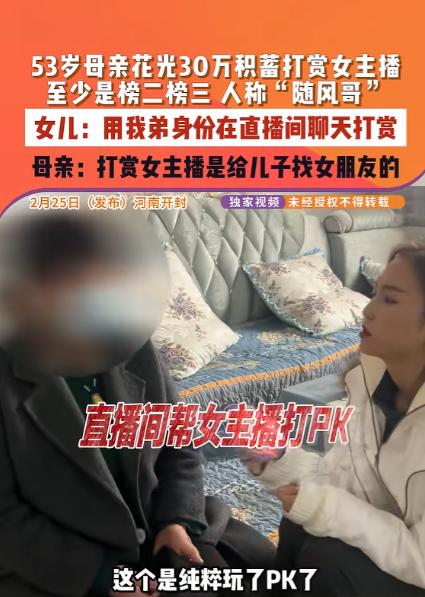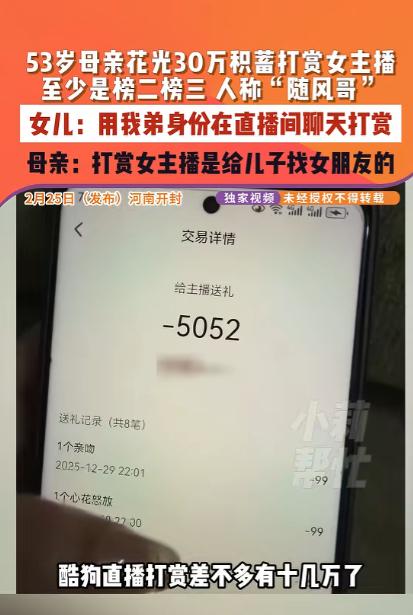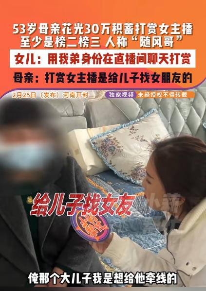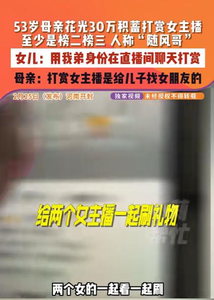 糊涂到家了!河南开封,53岁大妈瞒着所有人,悄摸摸将家里多年积攒的30多万积蓄,全部打赏给了女主播。更绝的是,她还用儿子的身份,给女主播发照片,要和对方谈恋爱。女儿发现后非常气愤,父亲在工地上干活,每天累死累活就挣200块钱,没想到就这样被母亲嚯嚯了。谁知,母亲竟理直气壮的表示:我是为了给儿子找对象! 谁能想到,河南开封一户普通人家,会因为一场直播,把半辈子的安稳日子搅得天翻地覆。 这家的日子过得全靠父亲在工地卖苦力支撑,天不亮就出门赶工,白天在工地扛钢筋、搬建材、和砂浆,顶着大太阳风吹雨淋,一天高强度干活超过十个小时,累死累活到手也就只有 200 块工钱。 就算一个月天天不休息,满打满算也才 6000 块收入,除去家里日常柴米油盐、人情往来,每个月能存下来的钱也就 3000 块出头。 这 32 万积蓄,是父亲起早贪黑干了整整 11 年,一分一厘抠出来、一滴一滴汗水换回来的家底,是给儿子备着结婚买房、老两口晚年养老的全部指望。 这位阿姨平时在家操持家务,闲着没事接触到手机直播之后,就慢慢陷了进去。一开始只是随便刷一刷打发时间,后来被一位女主播吸引,天天守在直播间里,从最初点点赞、发几句弹幕,到后来忍不住送小礼物,再到最后越刷越上头,彻底刹不住车。 为了在直播间里撑面子,她每次打赏都格外大方,长期稳居直播间榜二、榜三的位置,还给自己起了个网名叫 “随风哥”,在虚拟的直播间里找足了存在感。 更离谱的是,她为了让自己的行为显得 “名正言顺”,竟然偷偷翻出儿子的生活照,冒用儿子的年龄和身份,在直播间里和女主播私聊套近乎,说尽甜言蜜语,一门心思要和主播处对象。 在她自己的认知里,只要打赏够多、对主播足够大方,对方就真的能看上儿子,愿意从线上走到线下,最后嫁到自己家里来,她打心底里觉得,自己这不是乱花钱,而是在费心费力给儿子张罗终身大事。 这件事她藏得严严实实,每天躲在卧室里刷直播、转钱打赏,家人只当她是迷上玩手机,压根没往乱花钱上想。 家里的银行卡、存款全都由她保管,手机支付、线上转账都是她独自操作,整整两年多时间,她累计给女主播转账打赏 31.8 万元。 后来手里积蓄不够了,她还把女儿花 1.2 万给她买的金项链偷偷变卖,换来的钱也一分不剩砸进了直播间,前前后后加起来足足霍霍掉 33 万元。 最先发现不对劲的是女儿,她偶然想核对家里的存款,查银行卡流水时,看到密密麻麻全是指向直播平台的扣款记录,少则两三百,多则五六千,几十笔交易加起来数额惊人,女儿当场就惊出一身冷汗。 拿着完整的流水账单跟母亲对质时,母亲一开始还遮遮掩掩不肯承认,直到所有证据摆到眼前,才不得不说出全部实情。 让家人更无奈的是,这位阿姨没有半点愧疚之心,反而理直气壮地反驳,坚称自己做这一切全是为了给儿子找对象,还说主播早就答应见面,自己是在为家里办大事,根本不是败家。 面对家人的劝说和指责,她丝毫听不进去,依旧活在自己固执的想法里,完全没意识到自己的糊涂行为,毁了全家十几年的辛苦付出。 女儿得知真相后又气又心疼,气母亲被直播间的虚拟幻象迷得昏头转向,心疼父亲在工地拼尽全力挣来的血汗钱,就这么轻飘飘打赏给了陌生人。 儿子知道后也是哭笑不得,他从来没让母亲用这种离谱的方式给自己找对象,更没想到母亲会做出这样荒唐的事。 父亲知道全部真相后,整个人都愣在原地,半天说不出一句话,这个老实巴交干了一辈子苦力的男人,没吵也没闹,只是满脸疲惫地叹气,眼神里全是心酸和无力。 他省吃俭用一辈子,舍不得吃顿好的,舍不得买件新衣服,所有的辛苦都为了这个家,却没想到全部家底被妻子悄无声息挥霍一空。 原本和睦安稳的小家,因为这场荒唐的打赏行为变得气氛压抑,每天都充斥着无奈和沉默。 33 万,对于普通工薪家庭来说,是十几年的青春,是无数个日夜的辛劳,是一家人对未来的全部期盼,可最终都化作了直播间里虚无的礼物特效和几句客套的感谢。 直到家底被彻底掏空,这位阿姨依旧没有完全清醒,还坚守着自己那套荒唐的理由,留给一家人的,只有难以挽回的损失和数不尽的心酸。 对于这件事,您有什么想说的吗?欢迎评论区留言讨论。 信源:小莉帮忙2026-02-25——《2月25日(发布)河南开封,53岁母亲花光30万积蓄打赏女主播,至少是榜二榜三 人称“随风哥”……》
