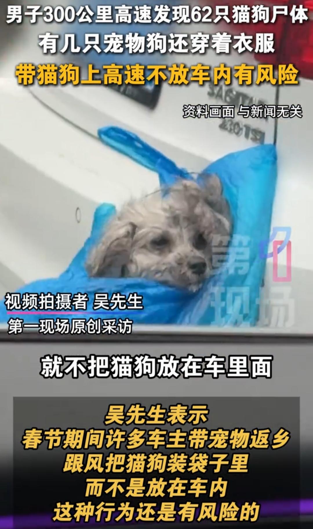 触目惊心!300公里高速62只猫狗尸体,穿着衣服的它们,死在返乡路 2月25日,四川乐山吴先生驾车跑300公里高速,一路数出62具猫狗尸体,平均不到5公里就有一条小生命殒命,看得人头皮发麻、心口发堵。 这些不是流浪动物:有的毛发干净,有的穿着小衣服、戴着项圈,明明是被主人捧在手心里的毛孩子。它们本该跟着家人团圆返程,却永远留在了冰冷的路面。 悲剧根源,全是主人的侥幸与省事:怕弄脏车就把宠物挂车尾、塞编织袋;不用航空箱固定,急刹就甩出车;车窗留缝,猫咪受惊直接跳车;更有人在服务区随手遗弃……高速车速快、车流密,一旦掉落,几乎无一生还。 更可怕的是,散落的尸体极易引发连环车祸,随意丢弃还存在防疫隐患,既害了生命,也坑了路人。 带宠回家不是负担,不负责任才是。请务必用固定航空箱、全程关好车窗,绝不外挂、不裸装、不遗弃。别让团圆路,变成宠物的绝路。 尊重生命,文明养宠,转发提醒更多人!🙏高速弃狗 宠物狗身亡