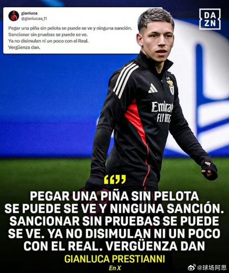 【追加处罚】被欧足联临时处罚停赛一场,本菲卡的普雷斯蒂安尼在社交媒体上发文炮轰欧足联,虽然不久后文章被删除,但他肯定会被欧足联就此事开出罚单。普雷斯蒂安尼写道:“无球状态下的肘击是允许的,不会受到处罚。看来,在没有证据的情况下进行制裁也是可能的。他们现在连掩饰对皇家马德里的偏袒都懒得做了。他们真是丢人现眼。”欧冠联赛