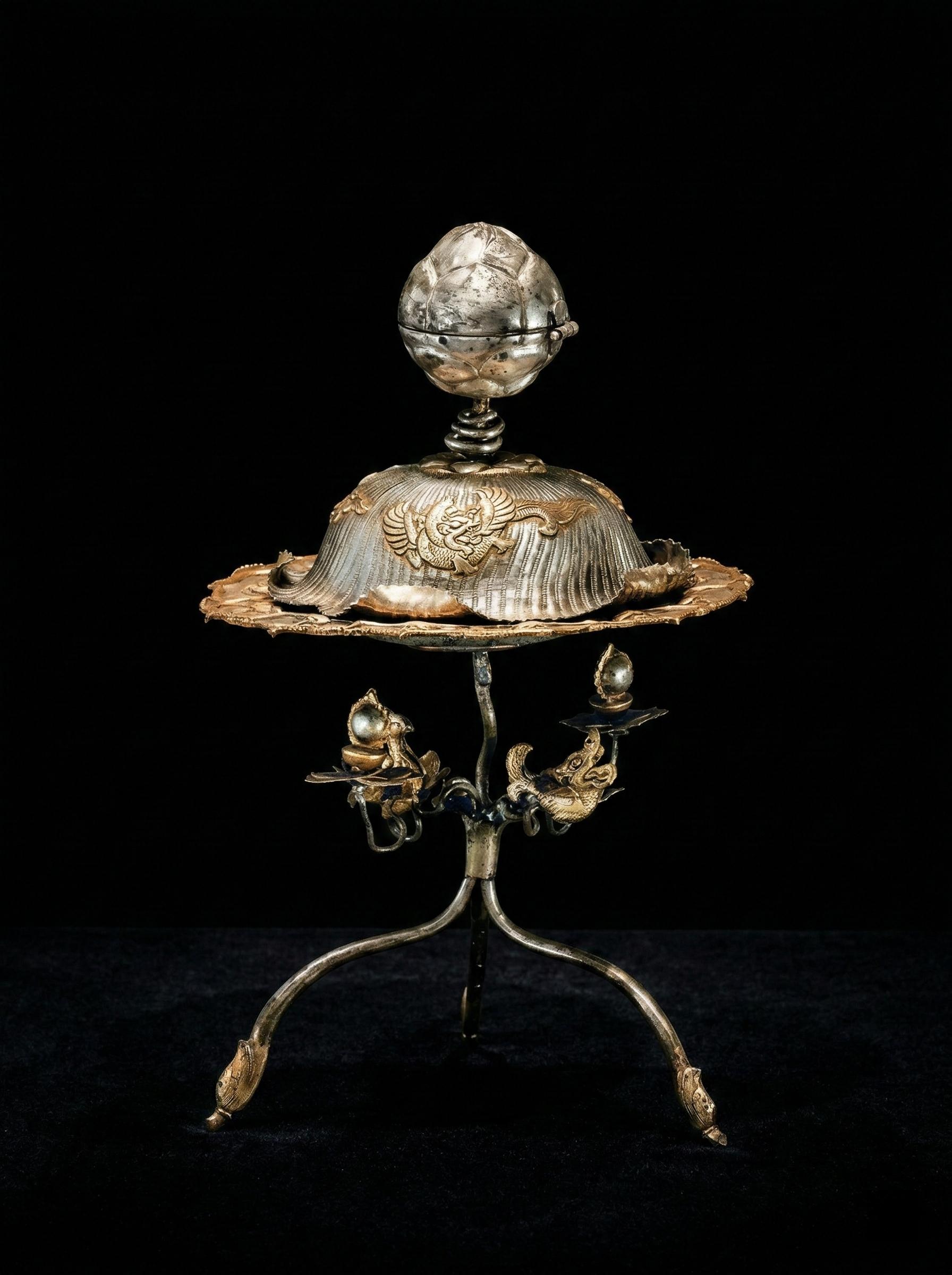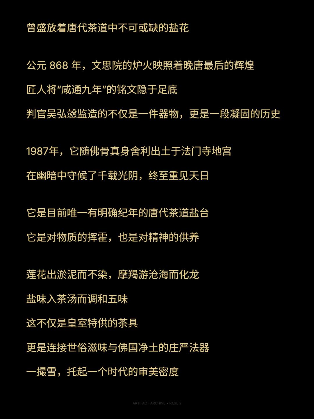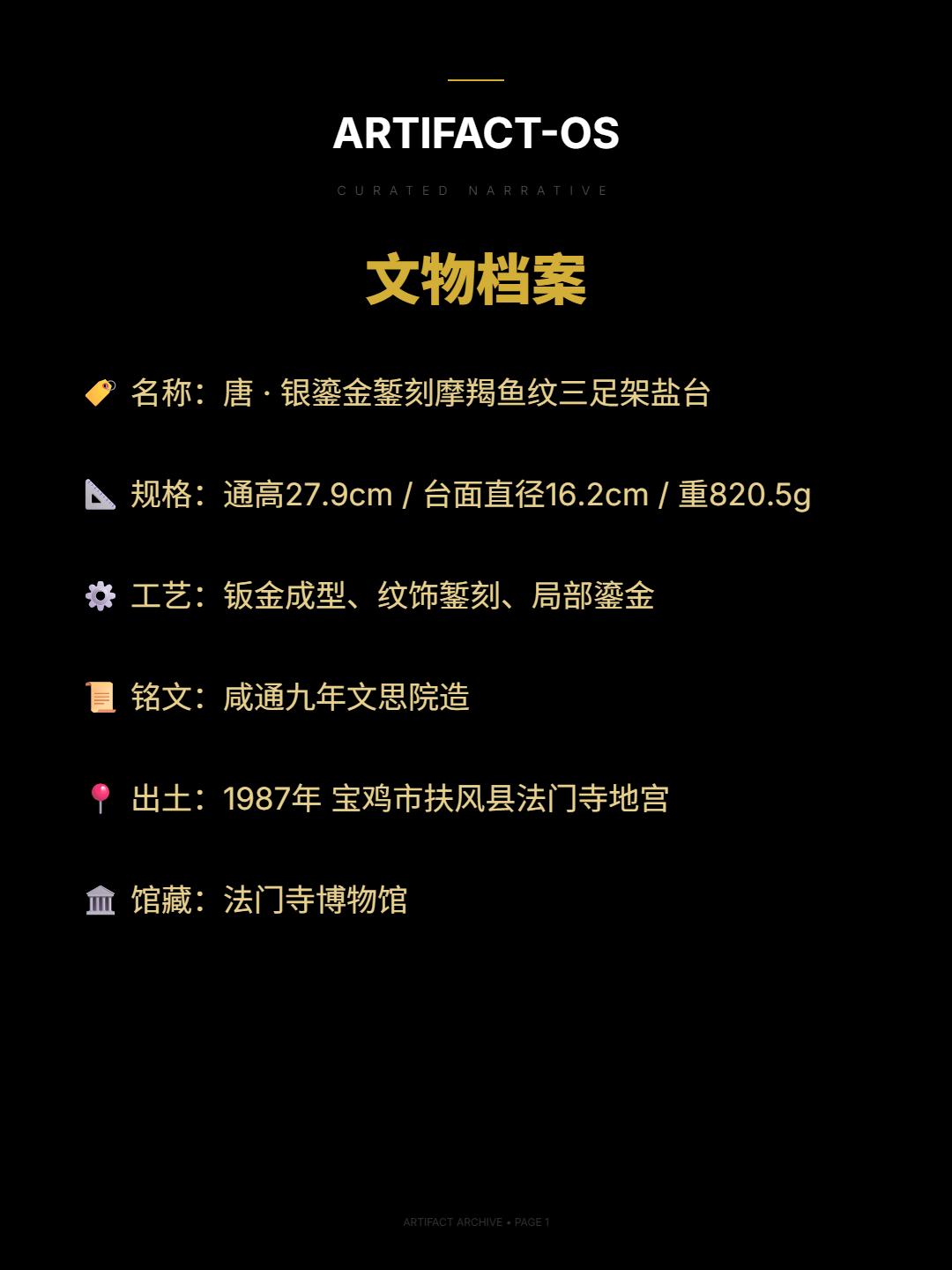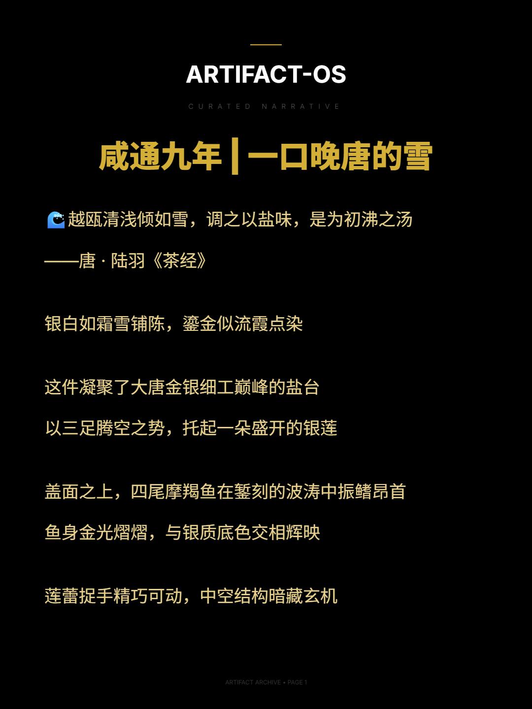 咸通九年 | 一口晚唐的雪。🌊越瓯清浅倾如雪,调之以盐味,是为初沸之汤——唐 · 陆羽《茶经》 银白如霜雪铺陈,鎏金似流霞点染 这件凝聚了大唐金银细工巅峰的盐台 以三足腾空之势,托起一朵盛开的银莲 盖面之上,四尾摩羯鱼在錾刻的波涛中振鳍昂首 鱼身金光熠熠,与银质底色交相辉映 莲蕾捉手精巧可动,中空结构暗藏玄机 曾盛放着唐代茶道中不可或缺的盐花 公元 868 年,文思院的炉火映照着晚唐最后的辉煌 匠人将“咸通九年”的铭文隐于足底 判官吴弘慤监造的不仅是一件器物,更是一段凝固的历史 1987年,它