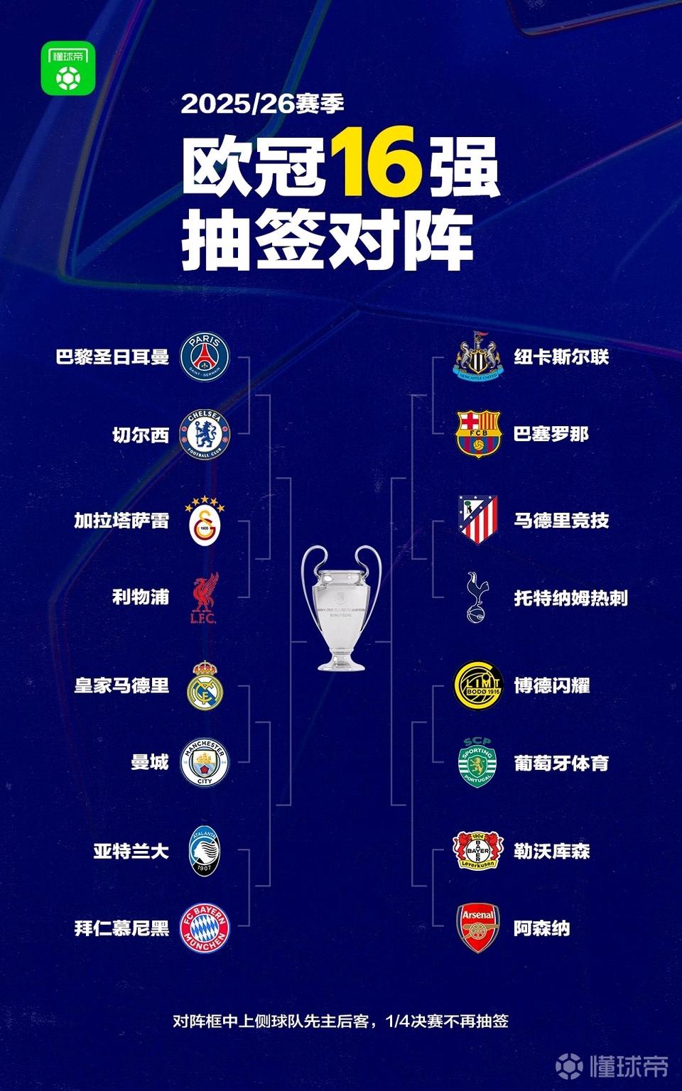 仔细看欧冠16强分区,保阿森纳夺冠? 左边赛区除了加拉塔萨雷,亚特兰大,足足有6个欧洲冠军的豪门。 右边赛区只有巴萨拿过欧冠冠军,更是给阿森纳创造最好的晋级之路。 他们先干掉勒沃库森,拿下博德闪耀或者葡萄牙体育,半决赛对巴萨? 右边赛区太弱了,像联盟杯。 左边太强,光是皇马VS曼城就噱头十足。[大金牙]