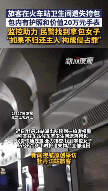 拿包女子也是真有意思,拿了别人的包还这么理直气壮和民警对话,就跟没事人一样,我估计她万万没想到这包有20万这么贵。 价格一说,她当时肯定吓得不行,后悔自己一时糊涂做的傻事。所以说,不是自己的东西不要拿,伸手必被抓。 不要心存侥幸觉得别人发现不了,现在监控很多,特别是火车站,那几乎是无死角的,一切行为都被照得清清楚楚。 也多亏了我们的民警,效率很高,6个小时迅速找回,为失主挽回了损失,相当给力,为他们点赞[赞]。 来源:新闻夜航 黑龙江牡丹江 天南地北大拜年 旅客在火车站遗失20万手表 民警找回