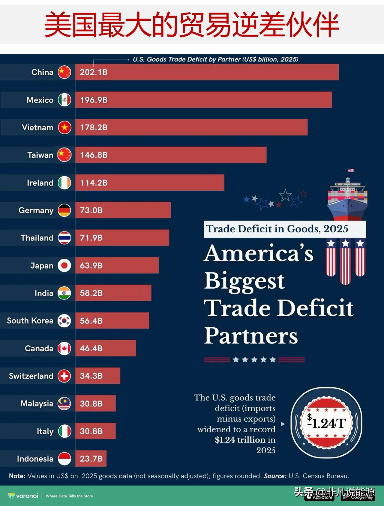 2025年美国的货物贸易逆差主要来自哪里? 2025 年,美国进口的商品数量远远超过了其出口的数量——这使得美国的货物贸易逆差达到了创纪录的 1.24 万亿美元。 仅前五名贸易伙伴就占了总贸易逆差的约 67%。下面这张图表列出了美国最大的货物贸易逆的前 15 位贸易伙伴,其中中国、墨西哥和越南位居前列。数据来自美国人口普查局。 从半导体产业到汽车业再到消费电子产品行业,这些贸易关系充分表明了美国的需求与全球制造业之间的紧密联系程度之深。 ——与三个国家的贸易逆差占总逆差近一半 中国以 2021 亿美元的贸易逆差位居榜首,紧随其后的是墨西哥(1969 亿美元)和越南(1782 亿美元)。这三个国家的贸易逆差总额占总逆差的 46%。 值得注意的是,几个亚洲和欧洲的出口大国在排名中占据主导地位,这凸显了美国在全球供应链中的深度参与。 中国长期以来一直是美中贸易紧张局势的焦点所在。尽管多年来美国采取了加征关税和“脱钩”等措施,但双边货物贸易逆差仍高达 2000 多亿美元。许多消费电子产品、机械设备以及中间产品仍从中国工厂流向美国消费者手中。 墨西哥 1969 亿美元的贸易逆差反映出其作为与美国供应链紧密相连的制造业中心的地位日益凸显,尤其是在汽车和电子领域。与此同时,越南 1782 亿美元的贸易逆差则凸显出随着企业逐渐摆脱对中国市场的依赖,生产已在亚洲各地进行转移。 在该榜单排名靠前的其他贸易伙伴中,包括中国台湾地区(1468 亿美元)和爱尔兰(1142 亿美元),这两个贸易伙伴都是半导体和药品的重要出口来源地。值得注意的是,美国与台湾地区的贸易逆差同比几乎翻了一番,在 2025 年增长了 99%。 ——为何贸易逆差会受到政治关注 贸易逆差本身并无绝对的“好”或“坏”之分。它们往往表明消费者需求旺盛以及资本流入。然而,政策制定者通常会将巨额且持续的贸易逆差视为制造业产能丧失或不公平贸易行为的迹象。 尽管 2025 年美国的总体贸易逆差几乎没有变化,但与某些贸易伙伴的双边贸易逆差仍存在政治敏感性问题。因此,关税被用于提高进口成本、鼓励国内生产,并迫使贸易伙伴达成新的协议。 不过,关税还可能增加企业和消费者的成本,尤其是在供应链紧密交织的情况下。