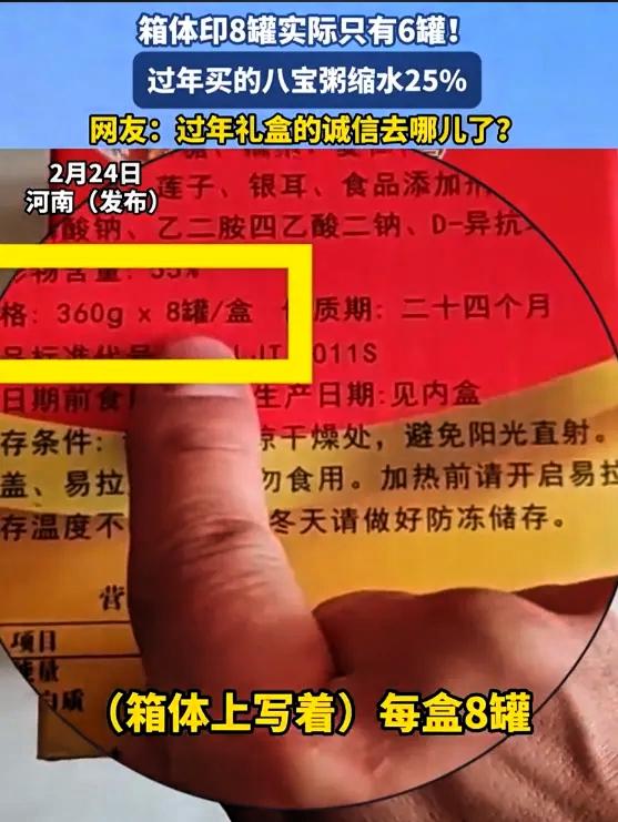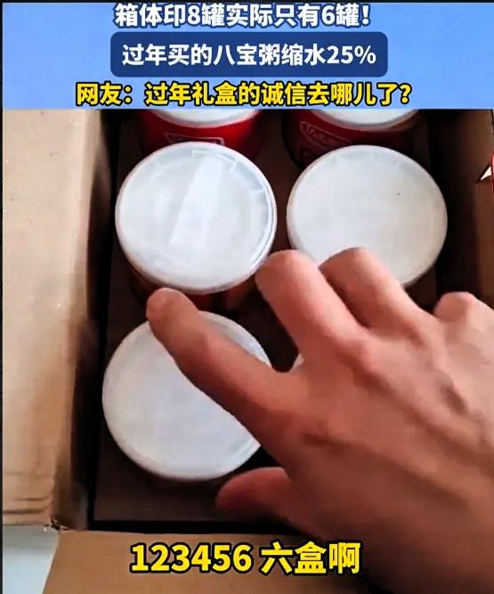 这下事情闹大了!河南,男子在家独自饿了,看到亲戚串门时送来的八宝粥,就想着打开喝一罐,发现包装标注为8罐,实际只有6罐,数量缩水明显,因此引发了不少消费者的共鸣。 春节期间,礼品礼盒是走亲访友的常见选择,大家看重的是心意与实用,可如今部分商品的包装与内容不符,已经成为很多人遇到的共性问题。礼盒外观设计精致、体积较大,容易让人误以为内容充足,可实际打开后,产品数量与标注不一致,不仅影响使用体验,也容易让送礼与收礼的人都感到尴尬。 类似情况并不只出现在八宝粥这类食品上,不少保健品、饮品、药品也存在过度包装的问题。外包装偏大、内部空隙较多,既增加了资源消耗,也产生了更多包装垃圾,对环境造成不必要的负担。对消费者来说,花费的成本更多用在了外观上,而不是产品本身,性价比明显偏低。 商家适当提升包装美观度可以理解,但过度追求外表、虚标数量,本质上是在消耗消费者的信任。节日消费本应是温馨愉快的事,一旦被套路化包装影响,很容易降低大家的购物体验,也不利于品牌长期发展。 理性的消费环境,需要商家诚信经营,做到标注清晰、货实相符,也需要相关方面加强对过度包装、数量不符等问题的规范与引导。作为普通消费者,我们在选购商品时,也可以多留意产品的实际规格、净含量和数量,不被外包装误导,理性选择更实用、更实在的商品。 节日心意不靠包装撑场面,实在与诚信才更让人安心。
