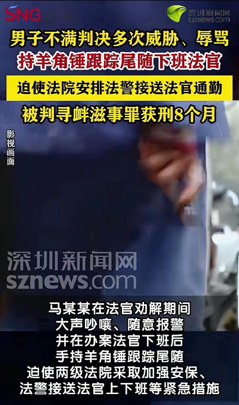 法官太难了!新疆乌克苏,男子因经济纠纷闹上法院,经过法院两审,结果都没能如他的愿。为了发泄私愤,男子多次打电话、前往法院公然辱骂、威胁承办法官,甚至在法官下班后,手持羊角锤尾随威胁法官,导致法官不敢上下班,只能让法警接送。检察机关介入后,男子悲剧了。 男子马某因为一桩经济纠纷,心里憋着一肚子火,实在无处发泄。 马某之前和别人产生了经济矛盾,闹得没法私下解决,只能把希望寄托在法院身上,本想着能通过打官司讨个自己满意的说法。 可谁知,案子先是在基层法院审理,判决结果出来后,马某觉得完全不合心意,不服气的他又提起上诉,一路打到了中级人民法院。 本以为二审能扭转局面,可二审的判决,还是没能如他所愿。 两级法院的审理结果都和自己的预期相差甚远,马某心里的怨气越积越重,他不反思自己的诉求是否合理,也不认可法院的依法判决,反倒把所有不满都算在了经办法官的头上。 马某觉得这是法官故意针对自己,越想越觉得憋屈,一门心思想着发泄私愤。 从那之后,马某开始不断找法官的麻烦。 他先是多次拨打中级人民法院的电话,一接通就对着电话那头的法官破口大骂,言语粗俗不堪,还夹杂着各种威胁的话,吓得接电话的工作人员都不敢多言。 不光是电话骚扰,马某还三番五次跑到法院的办公场所,当着其他工作人员和当事人的面,公然辱骂承办法官,声音大得整个办公区都能听见。 法官见他情绪激动,多次耐心上前劝解,想跟他讲清楚判决的法律依据,引导他通过合法途径表达诉求。 可此时的马某已经被愤怒冲昏了头脑,根本听不进任何劝告,不仅不收敛,反而在现场大声吵嚷、胡搅蛮缠,甚至还随意拨打报警电话,故意制造混乱,严重扰乱了法院正常的办公秩序。 即便如此,马某还是觉得不解气,他把恶意对准了法官的日常生活。 马某开始暗中留意法官的下班时间,偷偷守在法院附近,等法官一下班,就手持一把羊角锤,悄悄跟在法官身后尾随威胁。 羊角锤是具有危险性的工具,马某这样的举动,让法官时刻处在恐惧之中,精神高度紧张,连正常上下班都成了奢望。 因为马某的持续威胁,法官独自上下班充满危险,根本不敢独自出行。 为了保障法官的人身安全,两级法院不得不紧急采取措施,不仅加强了法院内部的安保力量,还专门安排法警接送法官上下班,这才让法官的安全有了保障。 马某只顾着发泄心中的不满,却不知道这样的恶劣行为,已经严重触犯了法律,绝非简单的发泄情绪。 检察机关很快介入调查,固定了马某辱骂、威胁法官,持凶器尾随恐吓的相关证据,依法以寻衅滋事罪对马某提起公诉。 《刑法》第二百九十三条第二款规定:有下列寻衅滋事行为之一,破坏社会秩序的,处五年以下有期徒刑、拘役或者管制:追逐、拦截、辱骂、恐吓他人,情节恶劣的。 马某因对两级法院民事判决不满,为发泄私愤,多次电话辱骂、到办公场所公然辱骂、持羊角锤尾随威胁法官,完全符合本条“辱骂、恐吓他人”的行为类型。 其行为多次发生、持续升级,并导致法官人身安全受威胁、不敢正常上下班,法院不得不安排法警护送、加强安保,严重影响他人工作与生活,造成恶劣社会影响,依法应当认定为“情节恶劣”。 法院审理后认为,马某无视国家法律,因对法院判决不满,公然辱骂、威胁司法工作人员,持凶器跟踪尾随法官,严重扰乱司法秩序,危害他人人身安全,构成寻衅滋事罪。 最终,法院依法判处马某有期徒刑八个月。 判决后,马某这才幡然醒悟,因为一时冲动,把合理的诉求变成了违法犯罪,不仅没能改变之前的判决,还把自己送进了监狱,落得个得不偿失的下场。 其实,对法院判决有异议,完全可以通过上诉、申请再审等合法途径解决,辱骂、威胁、恐吓司法人员,最终只会自食恶果。