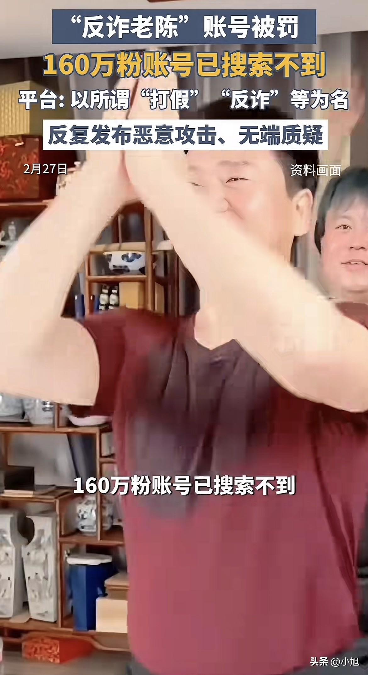 破防了,160万粉丝的大号,说没就没了。 2月27号下午,抖音官方直接点名"反诈*陈",说他在缺乏事实依据的前提下,以"喊话"形式反复发布恶意攻击内容,煽动网友对立情绪 。现在去搜他的主账号,已经显示不存在了。 老陈这次被罚,不是突然的事。半个月前他自己就发视频说要停更,说不管发什么,只要有人举报,视频就容易被下架。那时候他的健康分已经被扣到只剩28分,满分是100分 。 其实必须得说,老陈当初穿着警服做反诈宣传,确实干了不少实事。那句"你下载国家反诈中心APP了吗"能火遍全网,不是没道理的。他是真做过刑警、缉过毒的人,2017年就开始搞反诈,发传单、进社区、跑学校,效果不好才想到直播连麦 。那会儿他跟各种主播PK,把那些妖魔鬼怪吓得当场变脸,确实让很多人记住了反诈这事儿。他出的那本反诈书《你真的安全吗》,2023年给他带来了31万的稿酬收入,占当年总收入的一大半 。这说明他是真想把反诈这件事做下去的。 但问题出在哪?出在他脱下警服之后,路子走偏了。 官方通报里点得很明白,他未经司法与监管认定,就凭个人判断给商品、企业家和企业"定性" 。说什么企业存在"可怕的境外势力",说人家"采销团队存在贪腐",骂企业是"奸商"、"牛鬼蛇神" 。这些话,从一个曾经穿着警服反诈的人嘴里说出来,已经不是变味了,是直接越界。 被老陈"喊话"过的商家也没忍着。多名商家直接拿出质检报告,发声明说他的言论"均为不实信息,与事实严重不符" 。人家说他发布的内容忽视客观事实,纯粹是"武断宣称"产品质量有问题。那些涉嫌侵权的视频,被商家一条条举报下架。 更让人唏嘘的是,这不是他第一次因为打假被封。2025年,他的快手账号就多次被封禁。7月他发视频指认嘎子哥卖假手机,账号被封7天;8月他又质疑嘎子哥卖的手机非正品,结果酷派官方出来证实手机是正品,他道歉之后,直播间又因为"刻意炒作矛盾博眼球"被封了10分钟 。9月,账号再次被封。 一次两次被封,是不是该反思一下自己的打法有问题?但他没有停。2025年11月他还公开说,要继续打假 。 再看他的收入账本,更扎心。据扬子晚报报道,他辞职后三年总收入大概100万,打赏占了80万,卖货只有20万 。但挣得多花得也多,投资养羊赔了80万,开眼镜店又亏了20万。他2022年还能挣133万,到2023年掉到34万多,去年只剩31万出头 。2023年那30多万,有31万还是卖书的稿酬,直播收入几乎可以忽略不计。 钱没攒下,号也没了。 抖音这次下手挺狠,直接关了他的内容加热和商业变现功能,包括电商带货、星图商单、广告合作,全部没了 。对于一个靠流量吃饭的人来说,这比封号还难受——号还在,但已经废了。160万粉丝的账号,就这么成了一个空壳。 老陈的问题,不是他不努力。他是真努力,真折腾,真想把这条路走下去。但他的努力,用错了方向。早期反诈,他是用专业和身份说话,大家信他;后来打假,他只剩一张嘴,而且是越说越过界的那种嘴。从反诈到打假,从"你下载反诈APP了吗"到"你是奸商",他好像一直没找到脱下警服之后该怎么说话的方式。 以前是官方身份加持,说话有分寸,大家信他。现在是普通博主,再打着反诈旗号去攻击别人,味道完全不一样了。尤其是当他开始用"境外势力""贪腐"这种词去骂企业,这就不是反诈了,是蹭流量。官方通报里说得很清楚,他是在"通过标签化攻击,刻意煽动网友情绪、营造对立",目的就是"收割争议流量" 。 老陈曾经说过一句话:"不等平台封禁,我先停更"。现在平台替他做了决定。 对于老陈这事走到今天这一步,你怎么看?
