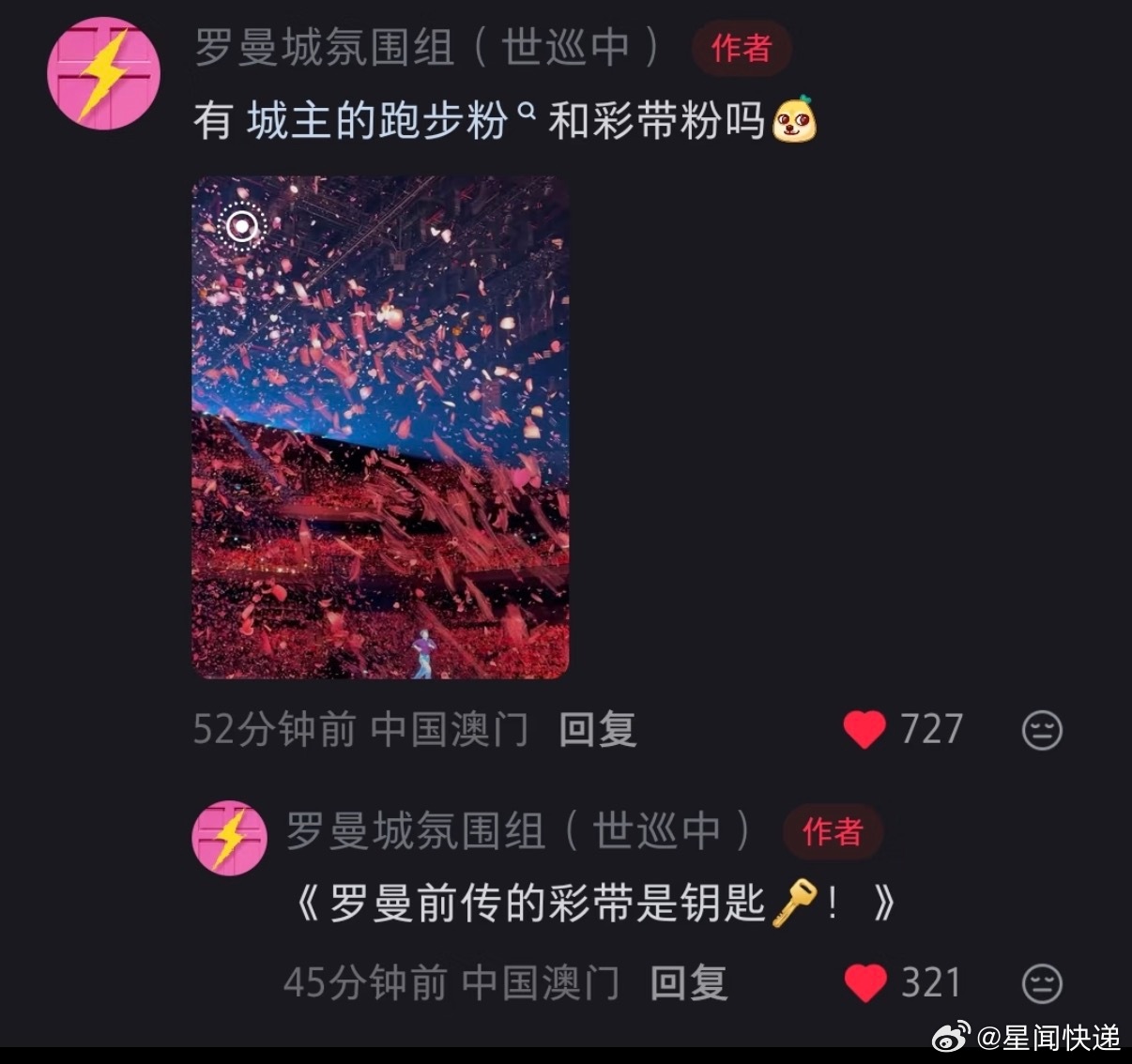 汪苏泷演唱会的彩带是钥匙汪苏泷“罗曼前传”演唱会的彩带居然是钥匙形状的,从舞台到应援周边全是同款钥匙设计,直接把“罗曼宇宙”的概念焊死在现场。