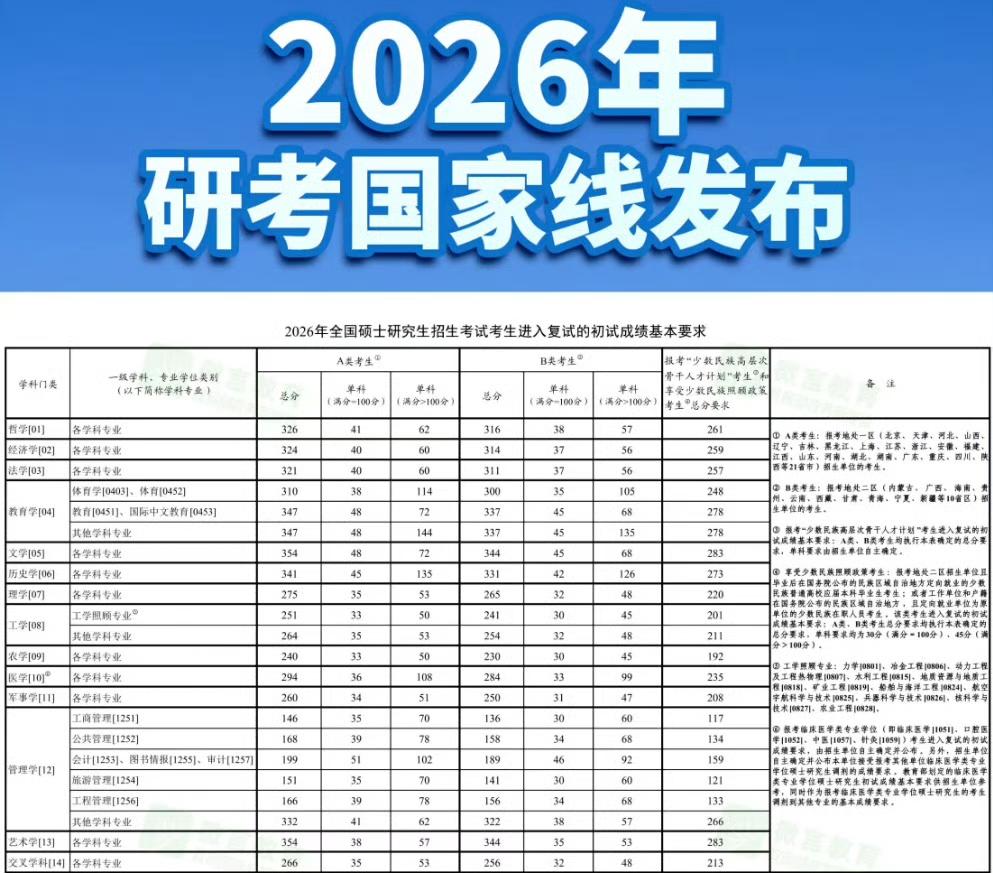 考研国家线终于揭晓,万千考生悬着的心也终于落了地,这一天对无数为了梦想日夜奋战的学子来说,是期待已久又忐忑不安的重要时刻,毕竟,国家线就像一道“门槛”,决定着大家能否迈进复试的大门,开启研究生生涯的新篇章。 回想起备考的日子,那真是一场艰苦卓绝的“持久战”,每天天不亮就起床背单词,深夜还在书桌前刷题,咖啡成了续命神器,黑眼圈成了奋斗的“勋章”,无数个日夜的拼搏,就为了在考场上那几个小时的全力以赴。初试结束后,大家也没敢松懈,一边焦急地等待成绩,一边又担心国家线的变化,心里就像揣了只小兔子,七上八下的。 今年考研的情况有些特殊,报名人数较去年减少了45万,实现连续三年回落,这背后,是很多考生理性的选择,考研竞争越来越激烈,不少人觉得与其在这条路上挤破头,不如先积累工作经验,或者寻找其他发展机会,而且,研究生招生计划还在稳步增长,重点向新工科、新农科、新医科以及国家急需紧缺专业倾斜。这就导致今年的国家线呈现出稳中有降、学科分化的特征。 从公布的结果来看,大部分学科分数线都有不同程度的上涨,只有法学、农学、工商管理等个别学科门类分数线有所下降或与去年持平,这一变化,让很多考生既意外又在意料之中,毕竟,热门专业竞争激烈,报考人数多,分数线上涨也在情理之中;而一些相对冷门的专业,为了吸引更多人才,分数线可能会有所调整,对于那些过了国家线的考生来说,这无疑是一个好消息,但也不能掉以轻心,接下来,还有复试这一关等着大家。复试不仅考察专业知识,还注重综合素质和应变能力。 而对于那些没有过线的考生,也不要灰心丧气。考研只是人生的一条路,不是唯一的选择,人生还有很多机会和可能,也许在其他领域,你能绽放出更加耀眼的光芒你可以选择就业,在工作中积累经验,提升自己,也可以考虑再战一年,总结经验教训,重新出发。 考研国家线的发布,就像一场考试的“中场休息”。无论结果如何,它都见证了大家的努力和付出。接下来,希望大家都能根据自己的实际情况,做出最适合自己的选择,向着梦想继续前行。 2026考研国家线发布 考研 事件来源:央视新闻