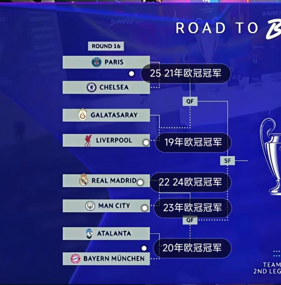有没有可能,今年冠军只在左半区? 左边全是冠军,比右边强大太多。 只有亚特兰大,加拉塔萨雷没冠军,6大豪门是最近几年的欧冠冠军。 右边巴萨还是遥远的2015年欧冠冠军,阿森纳更是0冠没有夺冠经验。 每年欧冠越是残酷的赛制,强强对话,最终冠军都出自这里,看好左边。[赞]