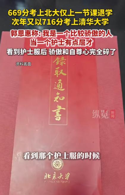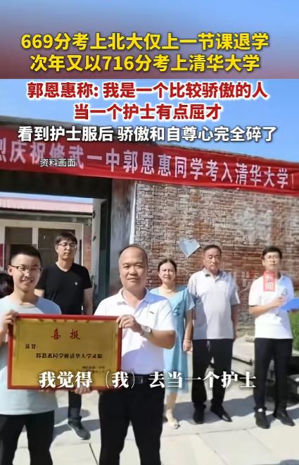 “北大哭了!”河南小伙,第一次高考669分考上北大医学部,结果第一节课都没上完就退学,回家复读,一年后再战高考考了716分,这回他转身进了清华,还换了自己喜欢的工科专业,最终保研成功! 在河南这样的高考大省,每年几十万考生挤在同一条赛道上,能考出 669 分的成绩,已经站在了无数人仰望的高度,而能拿着这个分数走进北京大学的校门,更是无数家庭梦寐以求的荣耀。 可偏偏有这样一位河南小伙,在拿到北大医学部录取通知书、成为旁人眼中天之骄子后,仅仅上完大学的第一节课,就毫不犹豫地选择退学,转身回家重新拿起课本复读。 一年之后,他以 716 分的耀眼成绩再战高考,这一次没有丝毫犹豫,径直走进了清华大学的校园,选上了自己心心念念的工科专业,如今更是顺利保研,走出了一条完全属于自己的人生道路,他就是郭恩惠。 郭恩惠来自河南焦作修武县的一个普通农村家庭,父母都是朴实的普通人,父亲常年在外靠体力劳作支撑家庭开销,母亲则在家操持家务,把所有希望都寄托在孩子身上。 高考放榜时郭恩惠考出了 669 分的好成绩,这个分数在当年的河南物理类考生中排名五百名左右,足以让他踏入国内顶尖学府的大门。 填报志愿时,年轻的他没能抵挡住北大的名校光环,即便清楚这个分数很难选到自己心仪的工科专业,还是抱着试一试的心态填报了北大相关志愿,最终被调剂到北大医学部护理专业。 收到录取通知书的那一刻,整个家庭都沉浸在喜悦之中,亲戚朋友纷纷前来道贺,村子里也传开了农家子弟考上北大的喜讯,在很多人看来,这是改变家族命运的时刻,是苦读十几年最好的回报。 可这份喜悦并没有持续太久,从被录取的那天起,郭恩惠心里就始终憋着一股说不出的别扭,他对护理专业没有丝毫兴趣,甚至一想到未来要从事相关工作,就会感到莫名的抵触。 录取后的两个月里,他常常被不安的情绪困扰,连睡觉都时常做噩梦,心里清楚这不是自己想要的未来。 带着复杂的心情踏入北大校园,两周军训结束后,正式迎来了大学的第一堂礼仪课。 课堂上,老师拿出崭新的护士服和配套的帽子分发给大家,当看到这套代表着未来职业方向的服装时,郭恩惠心里最后一丝犹豫彻底消散,取而代之的是难以言说的失落。 他后来坦言,自己是一个内心骄傲、自尊心很强的人,在他的认知里,这份职业与自己的追求和期待相差太远,甚至觉得有些屈才,眼前的护士服像一块沉重的石头,瞬间击碎了他所有的骄傲与自尊心。 这堂课他甚至没有坚持上完,就径直找到辅导员,认真地说出了自己想要退学的想法。 没有丝毫的拖泥带水,也没有被旁人的劝说动摇,仅仅两天时间,他就办完了所有退学手续,背着行囊离开了这座无数人挤破头都想进入的学府,踏上了回家复读的路。 这个决定在当时引发了不小的震动,老师同学觉得可惜,不少陌生人觉得他任性,甚至有人觉得他是在浪费宝贵的教育资源,可只有郭恩惠自己知道,及时止损,去追寻真正热爱的方向,才是对自己人生负责。 回到家乡开始复读生活,郭恩惠放下了所有光环,把自己重新变回一名普通的高考生。 河南的复读之路从来都不轻松,高强度的学习压力、对未来的未知、旁人的议论,都成了需要克服的难关,但他始终保持着清醒和坚定。 面对外界对他 “天才学霸” 的评价,郭恩惠直言,自己的成功从来不是只靠天赋,天赋和努力在他的学习里占比是 4:6,足够的努力才是支撑他走到最后的关键。 复读的日子里,他把时间利用到了极致,每天都学习到凌晨才休息,为了跟上学习节奏,他总会提前预习接下来的课程,把知识点提前梳理通透,避免课堂上浪费时间。 刷题是提升成绩的重要方式,有时候学校发的练习卷做完了,他就会趁着课余时间去老师办公室,悄悄拿一些备用卷子回来做,用不断的练习巩固知识、查漏补缺。 整整一年的埋头苦读,他把所有的精力都倾注在书本和试卷上,熬过了无数个深夜,也顶住了所有的压力,只为给自己一个重新选择的机会。 不知不觉又到了一年高考放榜日,郭恩惠交出了一份惊艳所有人的答卷,716 分!这个成绩让他拥有了绝对的志愿选择权。 这一次,他没有丝毫犹豫,彻底抛开名校光环的束缚,只认准自己热爱的工科,果断填报了清华大学,并顺利被录取。 从北大退学到清华保研,郭恩惠的故事从来不是一场所谓的 “任性逆袭”,而是一个年轻人忠于内心、勇于止损、靠努力兑现选择的真实历程。 在人人都看重名校、追捧热门专业的当下,他用自己的经历证明,人生从来没有固定的模板,不必活在旁人的期待里,不必被世俗的标准绑架,敢于追随热爱、愿意为选择拼尽全力,就能够走出属于自己的精彩道路。 对于这件事,您有什么想说的吗?欢迎评论区留言讨论。 信源:纵览新闻2025-06-23——《河南焦作的郭恩惠,669分考上北大仅上一节课退学,次年又以716分考上清华大学……》