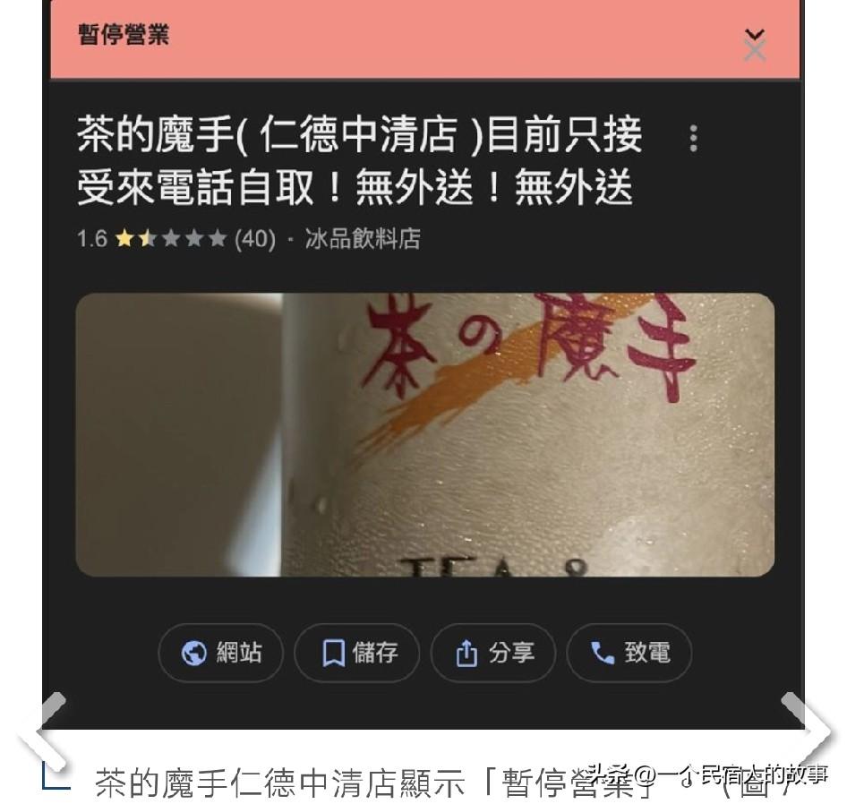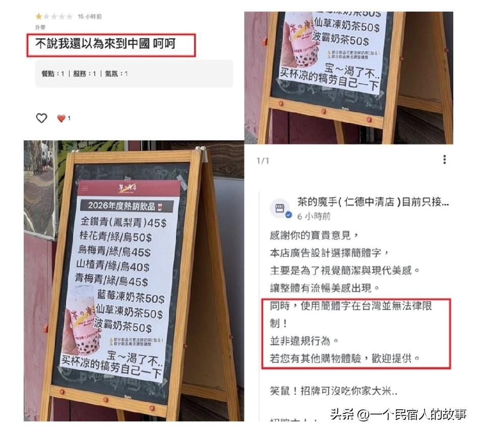 台湾奶茶店用简体字被青鸟骂到停业 今天岛内社会新闻最热搜是一家叫【茶之魔手】的奶茶店因为用了简体字,被青鸟出征骂到评分只有1星半,店家不忍回怼:使用简体字没违规,没吃你家大米!结果遭到青鸟更疯狂攻击!目前该奶茶店已经被骂到停业了。 可叹台湾社会已经魔怔了,不过乐见岛内往死里内斗。