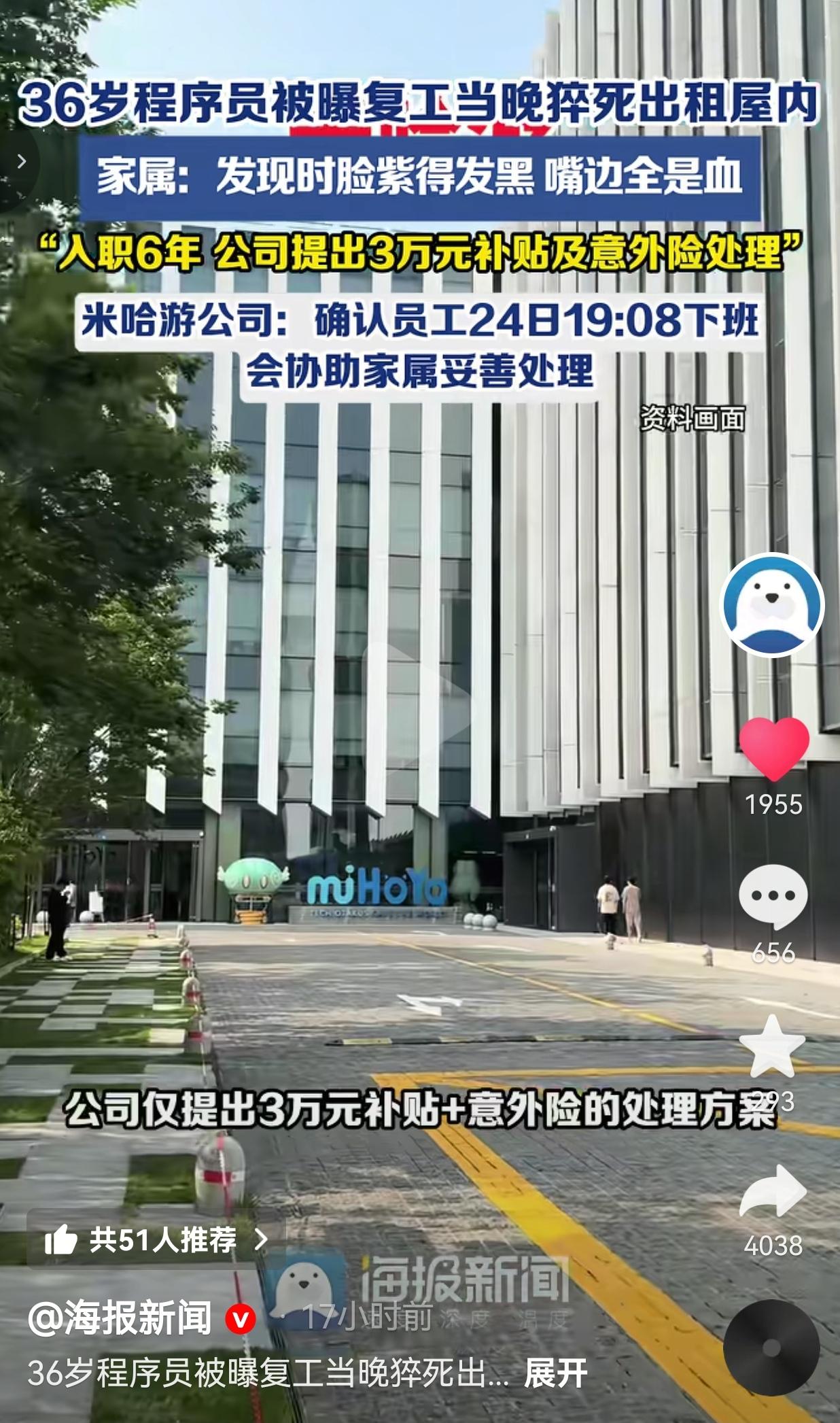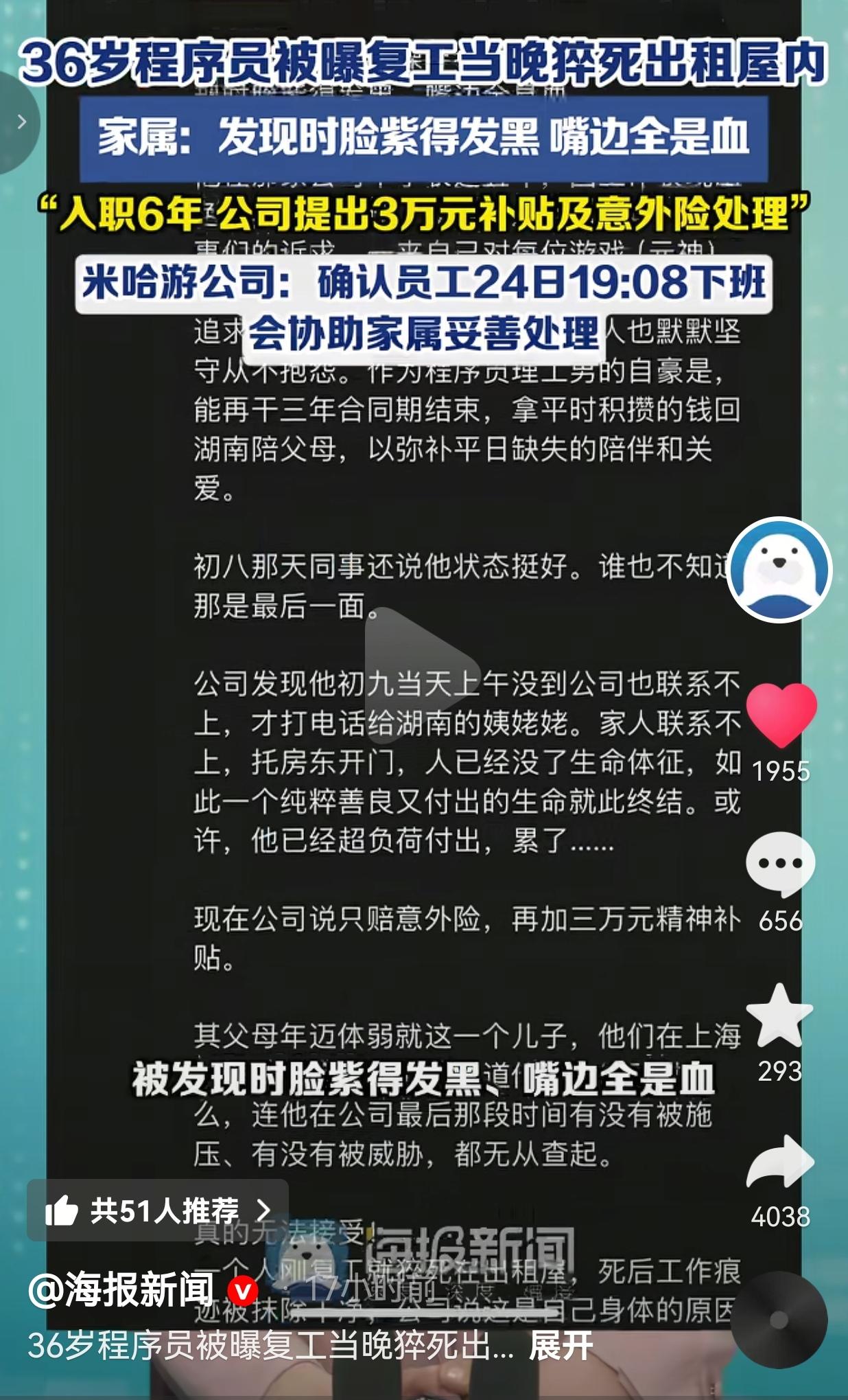 太痛心了!正月初八,上海一家出租屋里,一位36岁的男子再也没能醒来。 据了解,这名男子是米哈游的一名程序员,2019年12月入职,在公司并肩战斗了整整6年。 那天晚上,他洗完澡穿着睡衣倒在地上,被发现时脸紫得发黑,嘴边全是血。 同事说,初八那天他状态还挺好的,谁也没想到那是最后一面。公司确认他是在2月24日19:08正常下班,可到了25日上午,他却未如常参加早会,电话也联系不上。 出于对员工安全的担忧,公司第一时间联系了他远在湖南的家人与警方。等房东打开门,人已经没了生命体征。 他的父母年迈体弱,就这么一个儿子。他本来还想着,再干三年合同结束,就带着攒下的钱回老家,好好陪陪爸妈,弥补这些年缺失的陪伴。可现在,这个念想永远碎了。 更让人心寒的是,家属透露,公司给出的初步处理方案是:只赔意外险,再加3万元精神补贴。 家属说,他在公司最后那段时间有没有被施压、有没有被威胁,都无从查起。他的工作痕迹被抹得干干净净,公司说这是他自己身体的原因。 可是,谁能相信,一个前一天还在正常上班、和同事谈笑风生的人,会毫无征兆地倒在自己的出租屋里? 2月27日,米哈游官方与内部发文回应,确认了员工离世的消息,称其“工作认真,为人和善”,并表示已成立专项小组,在充分尊重家属意愿的前提下,全力协助家属处理善后事宜,提供一切必要的支持与陪伴,同时也强调公司有完整的员工关怀与保险兜底政策,包括商业保险、后事安置金、专项慰问补助等。 但对于家属而言,这些冰冷的文字和初步的方案,都无法抚平白发人送黑发人的锥心之痛。 有网友看到后评论说:“他为公司创造了价值,可公司只把他当成了一个可以随时替换的零件。” 还有的网友说:“3万块,连他在上海一年的房租都不够。这不是赔偿,这是对生命的践踏。” 我们总以为自己还年轻,熬夜、加班没有什么事情。可生命从来不会给我们“再来一次”的机会。这个倒在出租屋里的程序员,他不是个例,他是我们每一个在大城市里拼命奔跑的人的缩影。 我们拼命工作,是为了给家人更好的生活,是为了实现自己的价值。 可是,当我们的身体被透支,当我们的生命戛然而止,这一切又有什么意义呢? 所以说,一定要保护好自己的身体,撑不下去了,就算辞职,也别拿身体开玩笑。 大家觉得呢?欢迎大家评论区讨论留言。