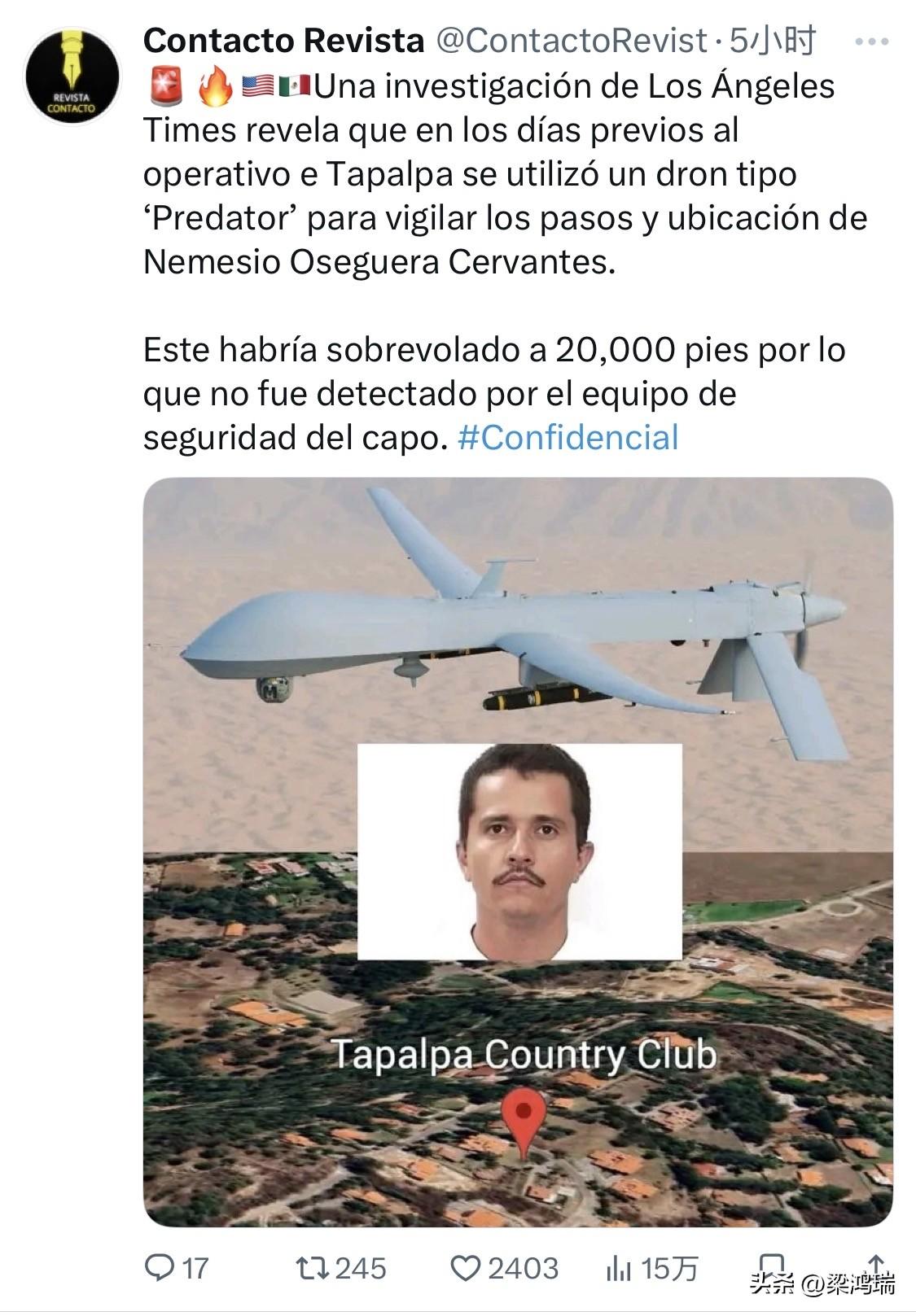 塔帕尔帕行动(Operation Tapalpa)是墨西哥武装部队于 2026年2月22日 在哈利斯科州塔帕尔帕市发起的一场针对性抓捕行动。此次行动成功击毙了墨西哥头号毒枭、“哈利斯科州新生代”贩毒集团 (CJNG) 头目内梅西奥·奥塞格拉·塞万提斯(绰号“埃尔·门乔”,El Mencho)。 《洛杉矶时报》的一项调查显示,在塔帕尔帕行动之前的几天里,在美国情报部门的支持下,墨西哥军方曾使用“捕食者”型无人机来监视内梅西奥·奥塞格拉·塞万提斯的行踪和位置。 据报道,这架飞机飞行高度为2万英尺,因此没有被毒枭的安保团队发现。