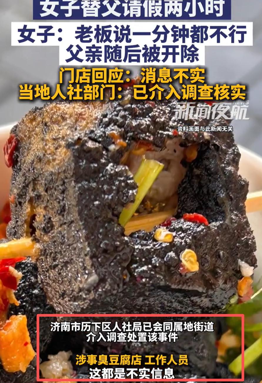 这下事情闹大了!山东济南,女子假期后准备回外地上班,临走前就想着和父亲吃顿饭,于是替父亲和打工的店铺请了两个小时的假,结果店家却说1分钟都不行,还直接把她的父亲辞退,女子直接硬刚到底,来到店前讨要说法 女儿一个简单的请求,却让父亲丢了工作。这家店的老板,心比他的店名还“绝情”。 济南宽厚里有家店,叫“绝情臭豆腐”。谁也没想到,老板做人做事,比这店名还绝。 店里有个54岁的大叔,是炸臭豆腐的师傅。他女儿在杭州工作,春节假期结束,初六就要回去上班。从年初一到初五,店里生意特别忙,大叔几乎没歇过,没好好陪家人吃过一顿饭。 女儿心疼父亲,想在走之前,陪爸爸吃顿饭。初五晚上九点多,她给老板打电话,想替父亲请两小时假,等晚上十一点后客人少了,去吃个饭就回来。女儿还说,这两个小时的工钱,她来出。 可老板想都没想,直接说:“一分钟也不行!”不仅不准假,还专门打电话威胁大叔:要是敢走,直接开除! 大叔没办法,为了保住工作,只好妥协。可更绝的是,第二天,老板还是以“旷工”为由,把大叔开除了,而且一分钱补偿都没给。 女儿知道后,气得浑身发抖。她直接找到店里,当着顾客的面,指着招牌怒斥:怪不得叫“绝情臭豆腐”,老板的心,比这名字还绝情! 这还没完,老板开除大叔后,还打电话给大叔的妻子,在电话里辱骂人家。有记者去问,店员态度恶劣,直接挂电话,也拿不出任何合理解释。 有网友看了直摇头,说这地点和店名太讽刺了。“宽厚里”的“绝情臭豆腐”,一点不宽厚,只有绝情。 也有人说,老板这么硬气,就是因为欺负打工人弱势。你抵制他一家店,还会有下一家。 说到底,这老板做事,于情于理于法,都说不过去。老人想陪孩子吃顿饭,天经地义。春节加班不给加班费,随意开除人不给补偿,这都违法了。对于这种没一点人情味、还欺负人的老板,就该用法律,给他来个“绝情”的处理。 对此,你怎么看?
