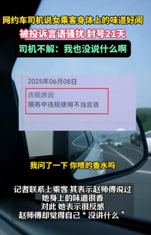 祸从口出。 网约车司机就因为在车上问了一句“你用的什么香水,这么香?”,结果被平台封了账号,21天不能接单。 这事发生在浙江。一个网约车司机,每天起早贪黑开车养家。那天他接了个女乘客,乘客一上车,车里就飘来一股挺好闻的清香味。 司机就是随口一问,说你用啥香水啊,味道挺好。女乘客回答,不是香水,是洗衣液的味道。司机就接了句,这洗衣液味道是挺好闻的。 全程就这么几句话。司机觉得这就是平常跟乘客拉个家常,没觉得有啥不对。 可女乘客下车后,反手就把他给投诉了,说是“言语骚扰”。平台核实后,真的把司机账号给封了,停止服务21天。 司机一下就懵了,觉得特别委屈。他老老实实开车,就因为夸了句香味好闻,怎么就成了骚扰?他家里就靠他开车赚钱,21天不能干活,车贷房贷、一家开销怎么办?他想不通,只好找记者帮忙,想问个明白。 从女乘客的角度想,可能就不一样了。一个女孩子单独坐车,对陌生司机本来就会有点警惕。司机反复问身上的味道,还说喜欢这个味,在密闭的小车厢里,可能会让她觉得不舒服,觉得私人空间被侵犯了,没有安全感。所以她选择投诉。 有网友觉得,这女乘客太敏感了。好闻夸一句怎么了,让人家21天没收入,至于吗? 也有网友认为,对陌生人,尤其异性,问这种私人味道的问题,就是越界了。聪明的回答应该直接说“洗衣液”,别多话。 说到底,现在人和人之间,信任和安全感太少了。大家压力都大,一点小事就可能炸。司机觉得是无心闲聊,乘客可能就觉得是冒犯。平台为了保障乘客安全,宁可从严处理。 这事没有绝对的对错,就是立场和感受不同。但结果就是,一句无心的话,让一个养家的司机付出了沉重代价。这社会,有时候真让人不知道该咋说话了。 对此,你怎么看?