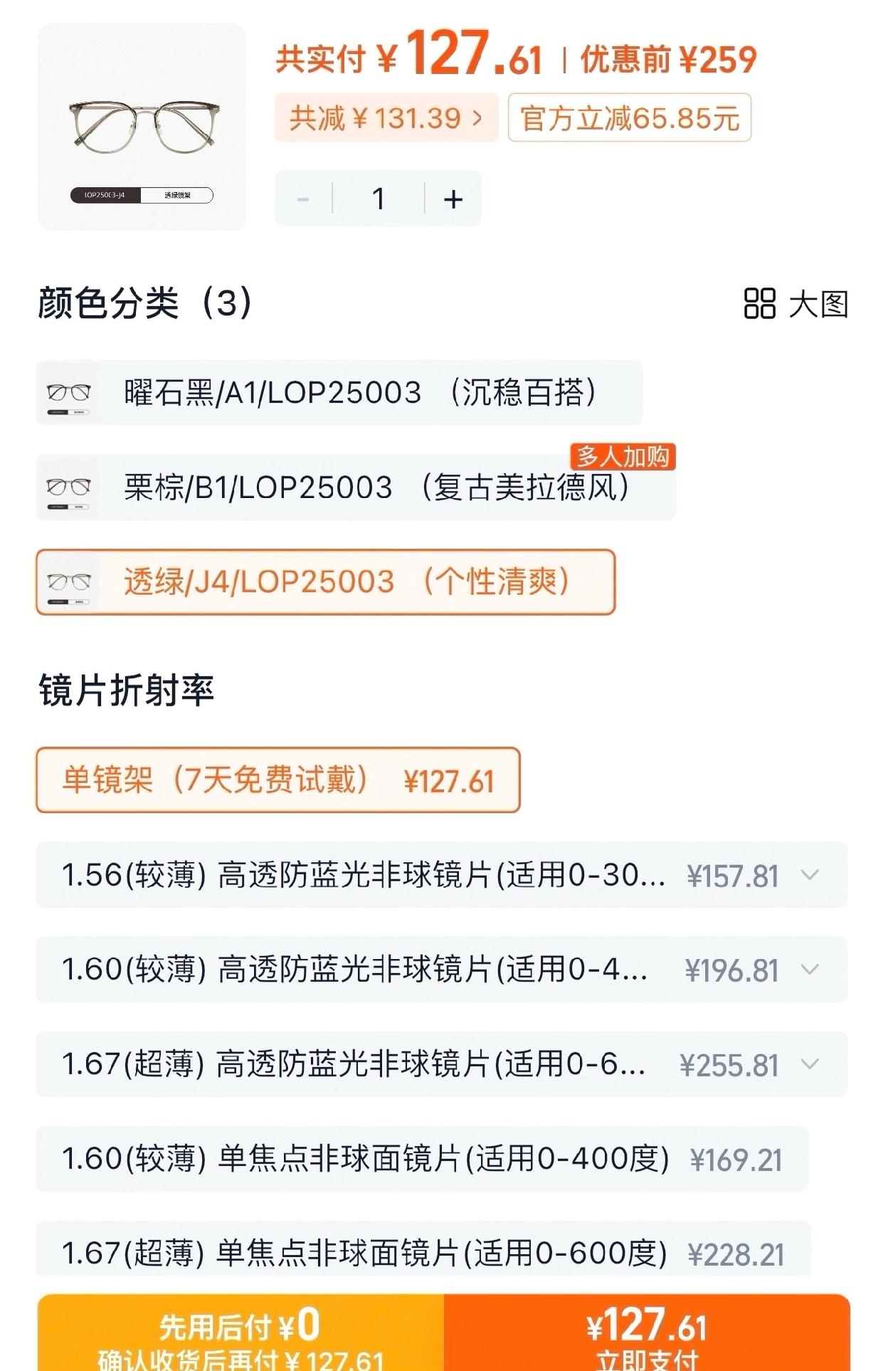 眼镜行业就是暴利 实体店镜框599,还好生日礼有200券,实付389,无意淘宝官网一看,血压上来了,就要127。差这么多。还不算镜片的差价。由于在李佳奇直播间买了loho的镜片券3张600块,面值是1200。到了loho店里面说直播间的券只能用他们家自己牌子的镜片。所以1200块钱只是没有牌子的镜片的钱,1.74折射率。