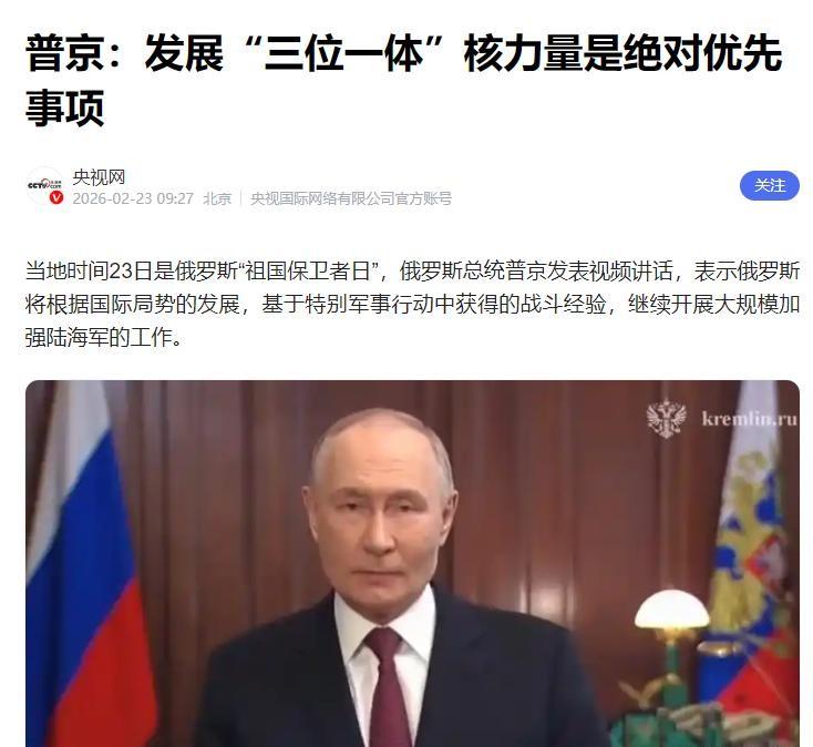 俄军核力量突然被推到最前面,不是因为想打架,而是因为很多事没法按老办法办了。2月23日那天,普京没挑24号开战纪念日讲话,专选“祖国保卫者日”——这日子本来就是讲怎么守住自己家的,不是讲怎么打别人的。 他说话挺平,但句句落地:发展“三位一体”核力量是“绝对优先事项”。这话不是喊口号,是真金白银在调。2026年国防预算里,核现代化的钱占了快四成,比前些年高了一大截。工厂加班造导弹,大学刚毕业的理工生要先去核基地干两年,连潜艇都排着队下水,“彼尔姆”号、“哈巴罗夫斯克”号今年全要开始战备值班。 很多人以为核弹多就是硬气,其实背后是常规战场拖不动了。乌军去年拿了1300多辆西方坦克,俄方只交了420辆;前线推进速度从2023年每月3公里,掉到去年不到1公里。通信老被干扰,坦克修不过来,兵员补充也慢。这时候把核力量顶上去,不是为了赢,是为了别输得更难看。 新削减战略武器条约早就没了,美国在波兰试射射程1600公里的巡航导弹,离莫斯科才1200公里。俄罗斯一看,光靠互相报数、互相检查,已经拦不住对方动作了。与其等别人动手,不如先把自家的底牌理清楚。 三国首脑这几天轮着来北京,德国总理24号刚落地,会谈还没出结果。但普京讲话里那句“核稳定不容试探”,其实已经划了线——你们可以谈停火、谈边界、谈监督,但只要碰核红线,前面所有谈判都白搭。 2月27日开会,桌上摆的不是地图,是算盘。一边算常规部队还能撑多久,一边算核弹头装填快不快。没人喊开战,但也没人再说“慢慢来”。